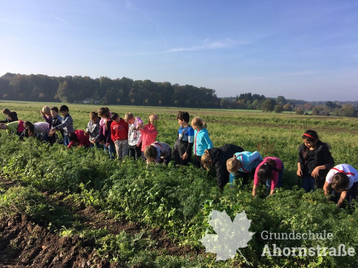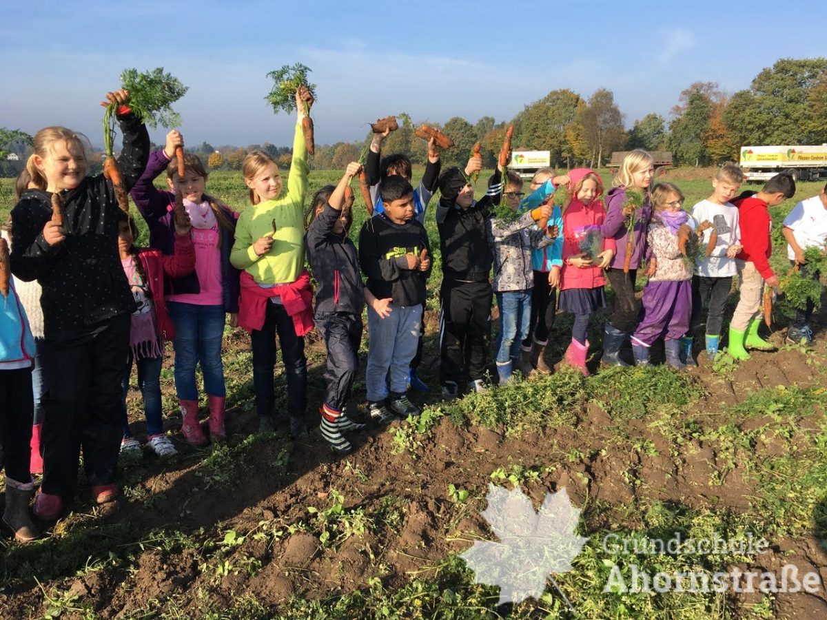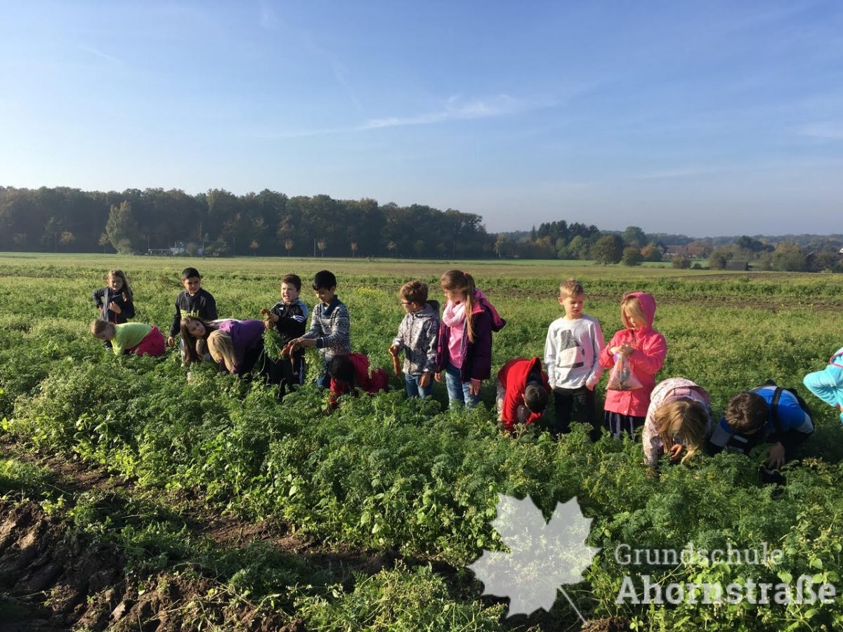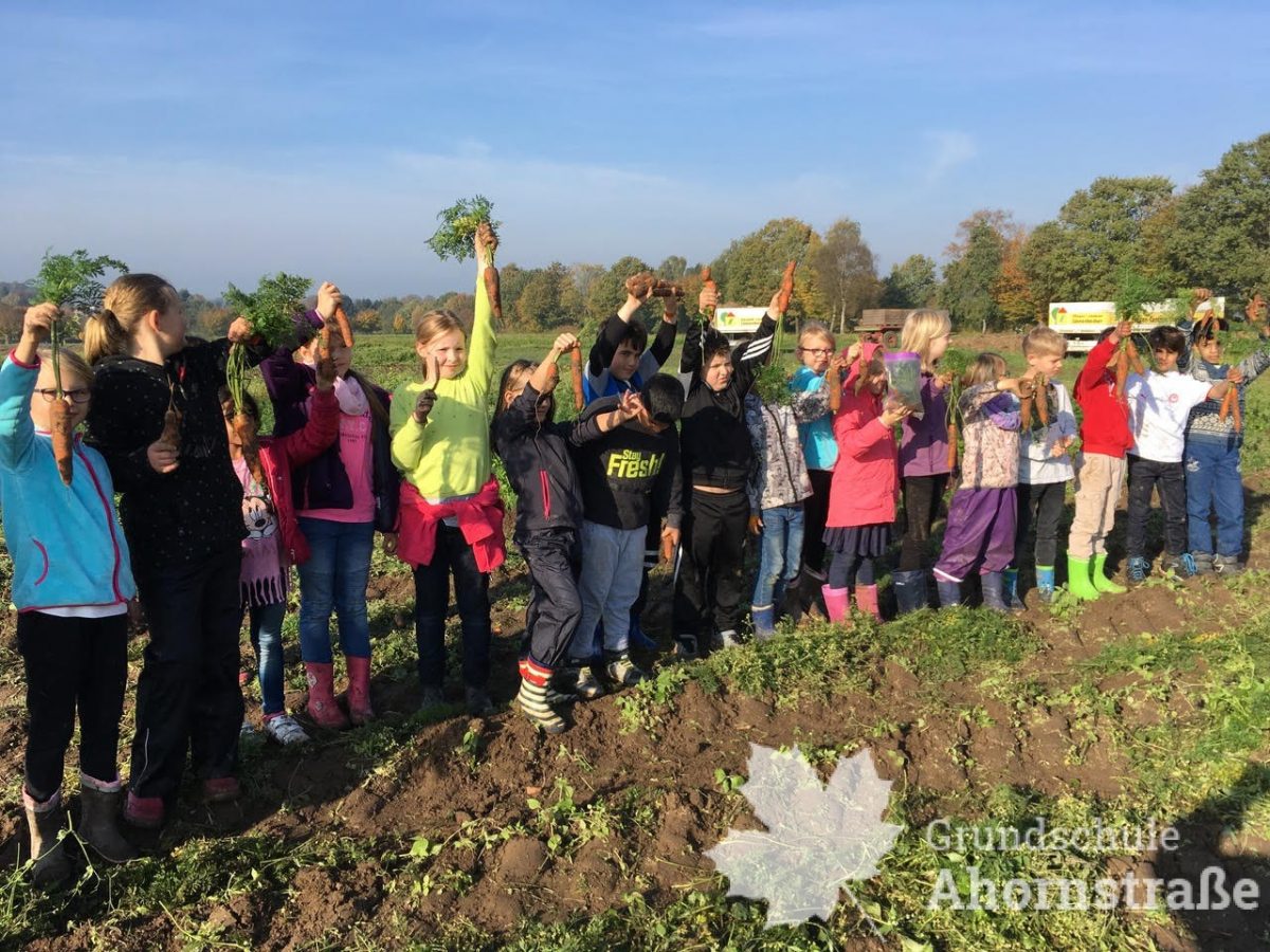 Bei strahlendem Sonnenschein besuchte heute die 3c einen Biohof. Es handelt sich um den Knollmannshof, der von der Familien Weißenbach betrieben wird. Familie Weißenbach liefert uns auch das Schulobst. Auf dem Gelände des Hofes im Fritz-Niewald-Weg 1 (Lockhauser Straße) gibt es einen Hofladen. Wir wurden mit einem Planwagen abgeholt. Bereits im Planwagen bekamen wir leckere Möhren. Auf dem Feld sahen wir zuerst die Möhren-Ernte-Maschine, dann durften die Kinder selbst Möhren ziehen. Auf dem Hofgelände wurde uns der große Kühlraum, die Möhrenwasch-Anlage und das Packen der Obstkisten gezeigt. Familie Weißenbach liefert auch Bio-Kisten. Hier einige Bilder dieses wunderschönen Ausflugs: