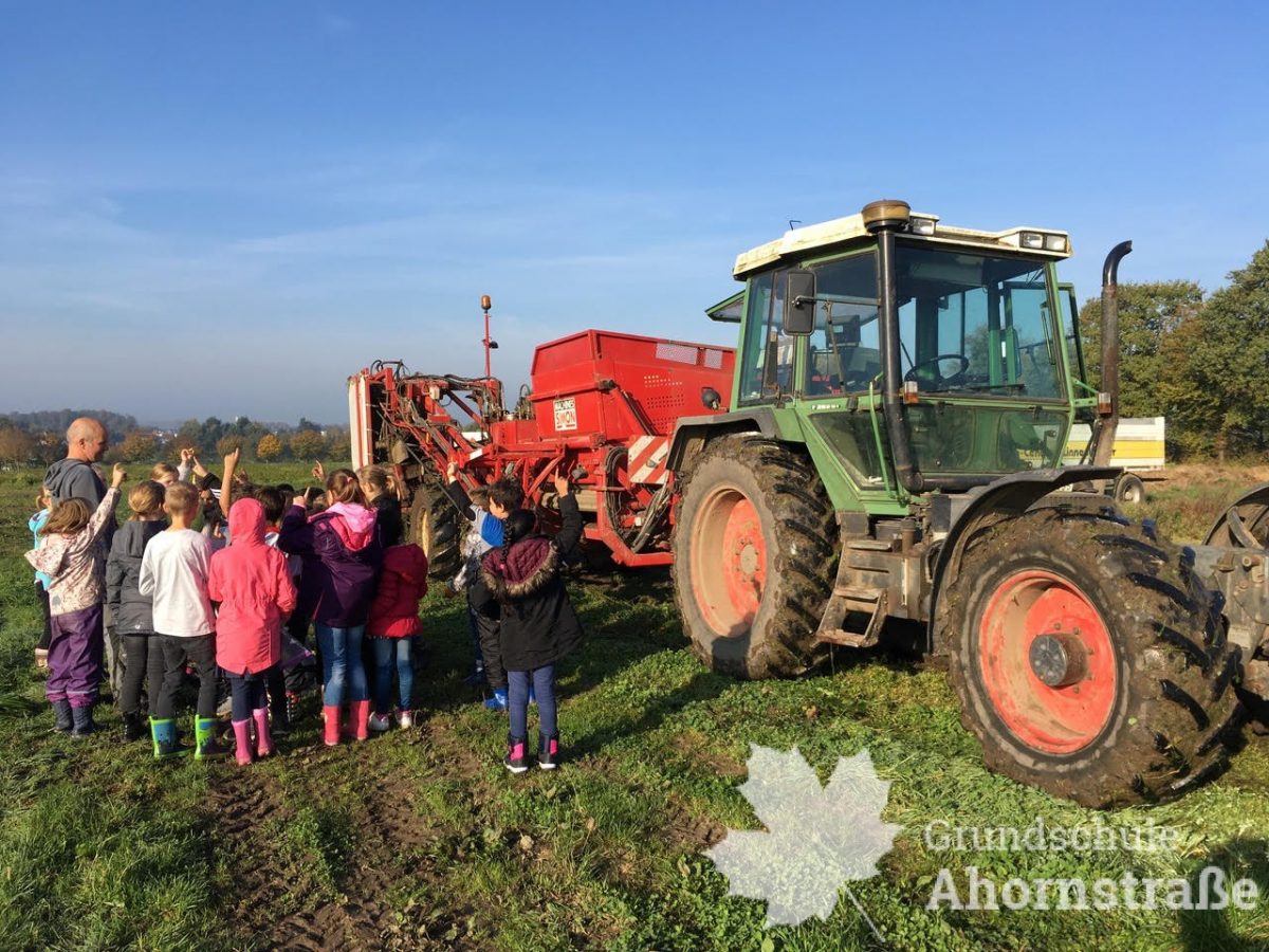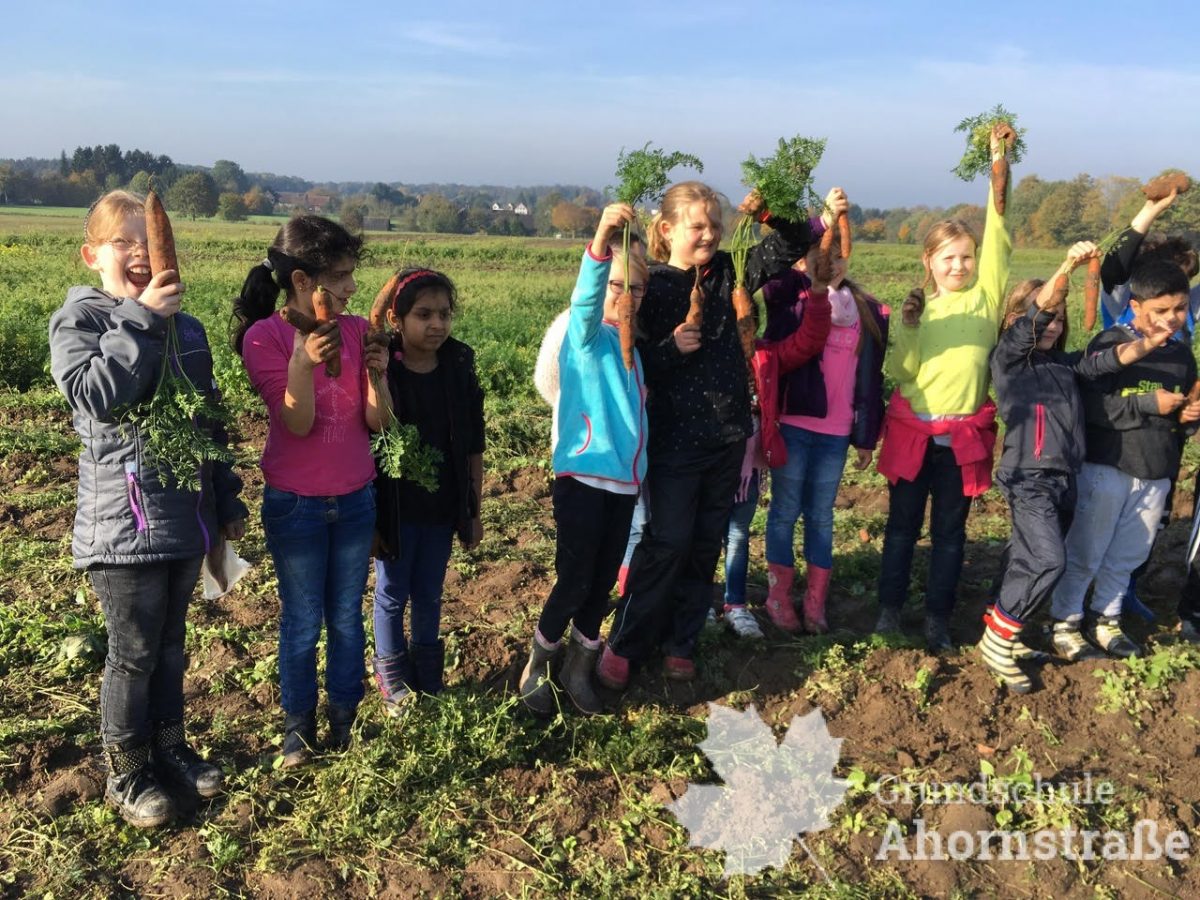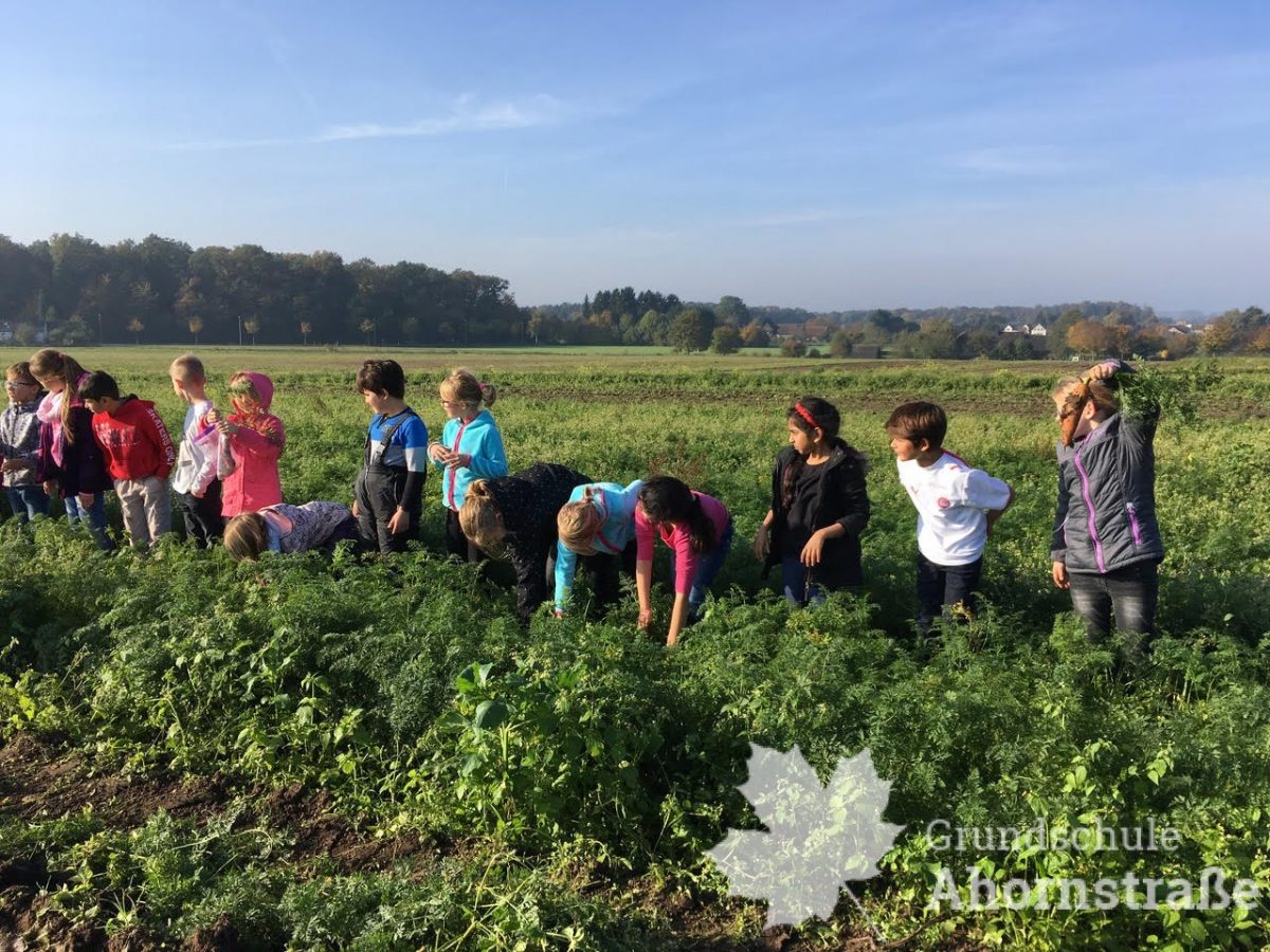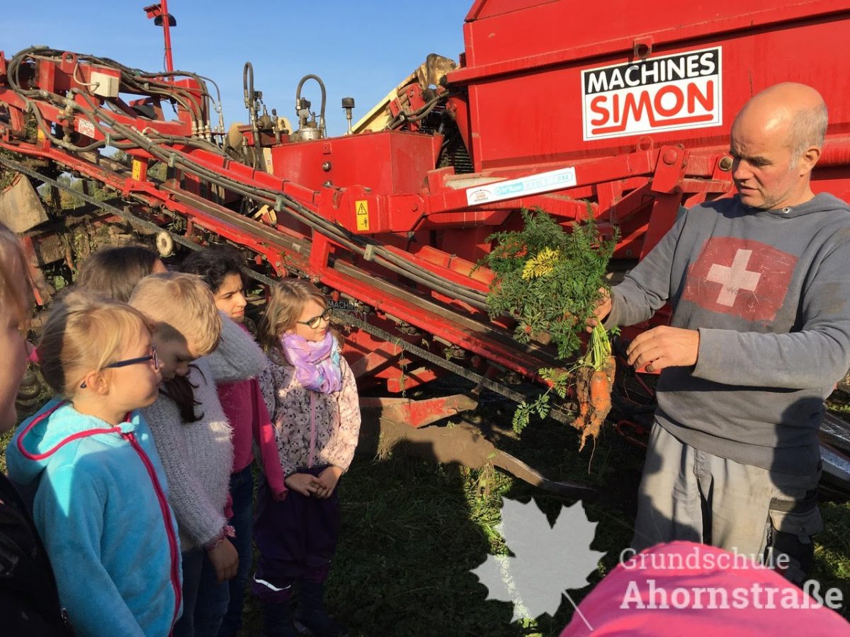 Bei strahlendem Sonnenschein besuchte heute die 3c einen Biohof. Es handelt sich um den Knollmannshof, der von der Familien Weißenbach betrieben wird. Familie Weißenbach liefert uns auch das Schulobst. Auf dem Gelände des Hofes im Fritz-Niewald-Weg 1 (Lockhauser Straße) gibt es einen Hofladen. Wir wurden mit einem Planwagen abgeholt. Bereits im Planwagen bekamen wir leckere Möhren. Auf dem Feld sahen wir zuerst die Möhren-Ernte-Maschine, dann durften die Kinder selbst Möhren ziehen. Auf dem Hofgelände wurde uns der große Kühlraum, die Möhrenwasch-Anlage und das Packen der Obstkisten gezeigt. Familie Weißenbach liefert auch Bio-Kisten. Hier einige Bilder dieses wunderschönen Ausflugs: