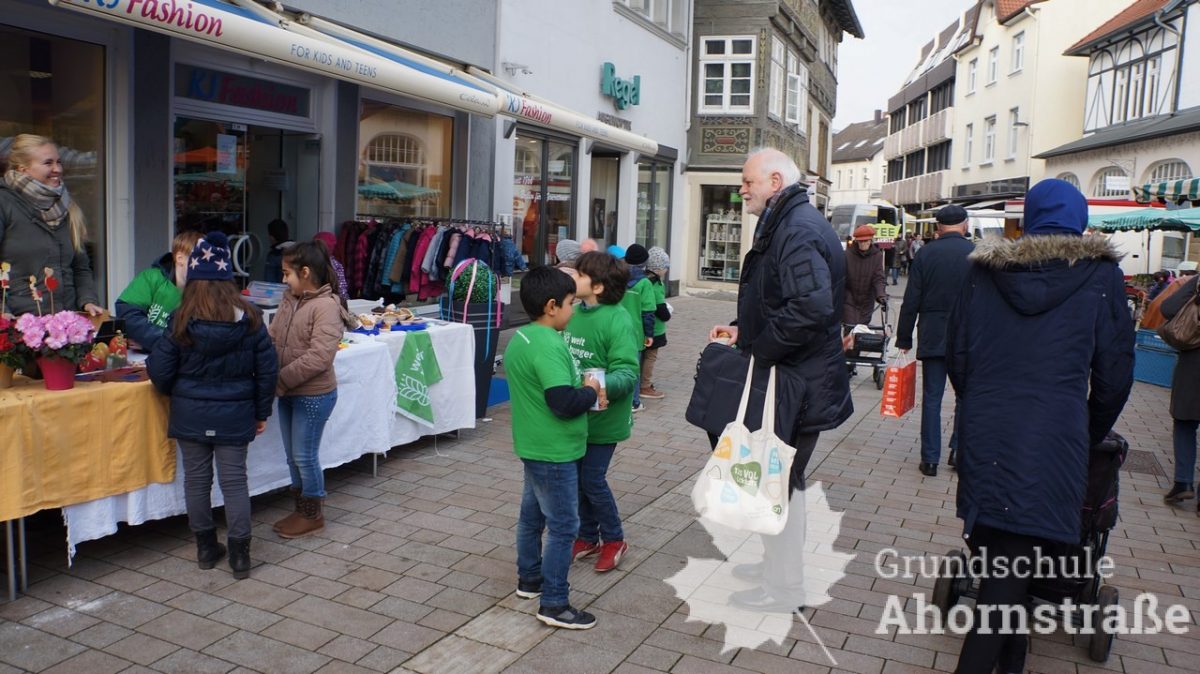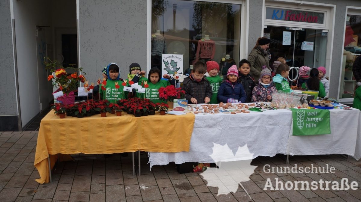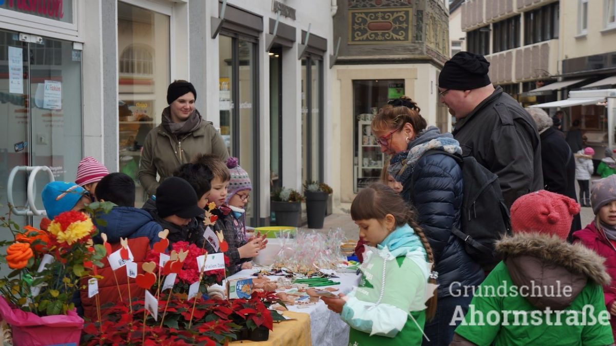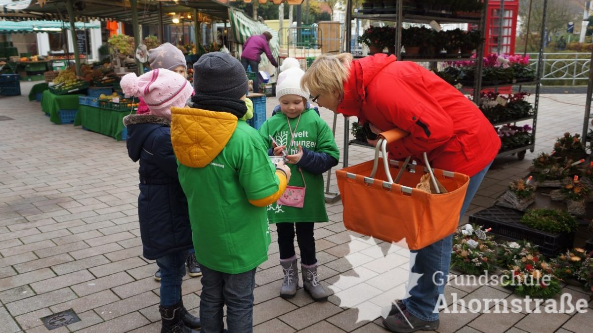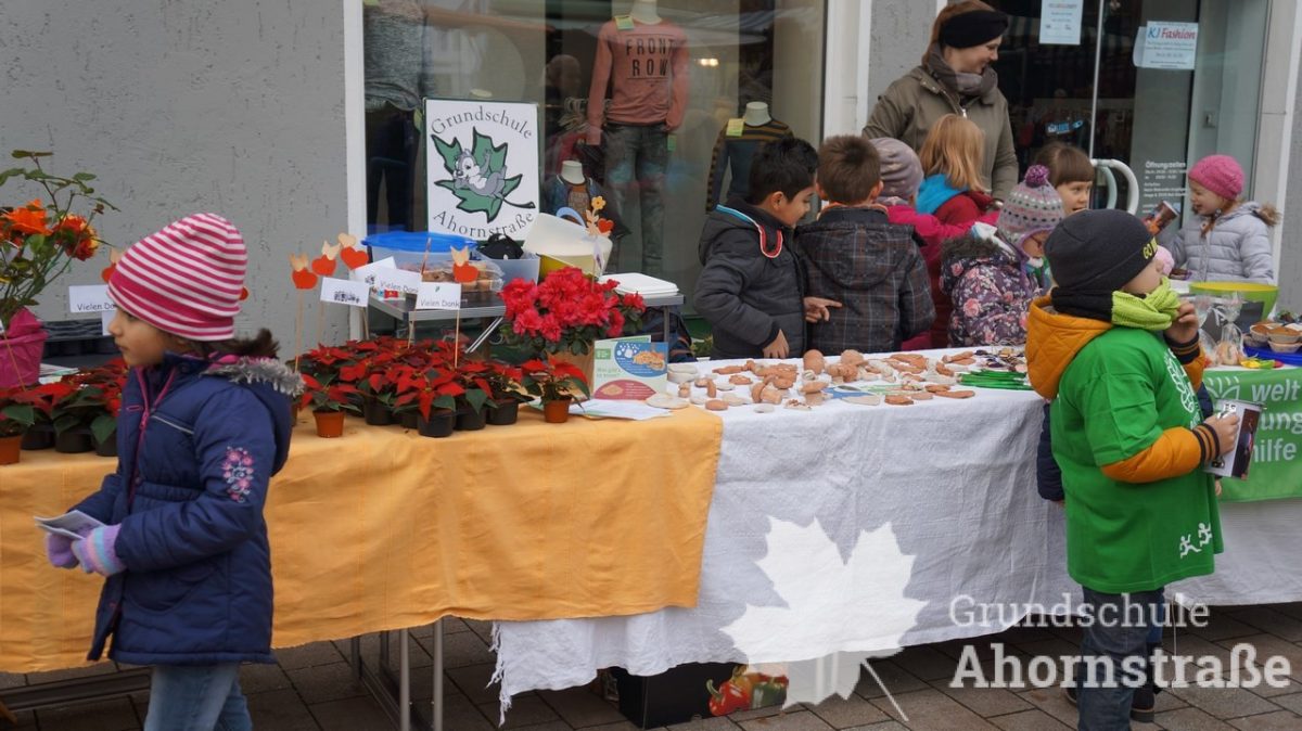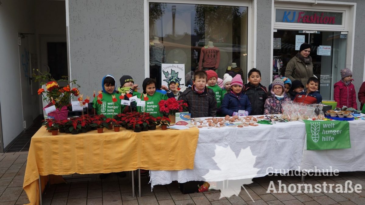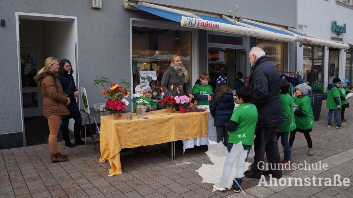 Heute war es soweit: Die ersten Klassen zogen mit Blumen, Muffins, Keksen, Selbstgebasteltem und Tischen in die Stadt. Die Ahörnchen sammelten wieder einmal Spenden! Mit vorherigen Aktionen haben wir z. B. unser Zirkusprojekt oder unsere Musikanlage mit finanziert. Diesmal wollten wir etwas über den Tellerrand schauen und sammelten nicht für unsere Schule, sondern für Menschen, denen es nicht gut geht. Das Geld sollte an die Welthungerhilfe gehen, die mit ihren Spenden Lebensmittel an hungernde Menschen liefert, aber auch z.B. den Brunnenbau in wasserarmen Regionen und den Aufbau von Schulen fördert. Den Aufbau des Standes und die erste Schicht übernahm die Klasse 1a, es folgte die Ablösung durch die 1b, bis schließlich die 1c folgte, die die letzte Schicht sowie den Abbau übernahm. Vielen, vielen Dank an alle Eltern, die diese Aktion durch z.B. das Backen von Muffins oder durch die tatkräftige Unterstützung beim Spendensammeln unterstützten – jede Klasse wurde von einigen Eltern begleitet. Vielen Dank auch an Frau Flagmeier und Elena, die von 8:00 Uhr bis 12:30 Uhr in eisiger Kälte für die Kinder da waren!