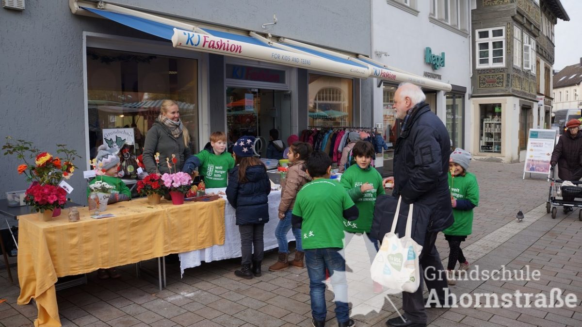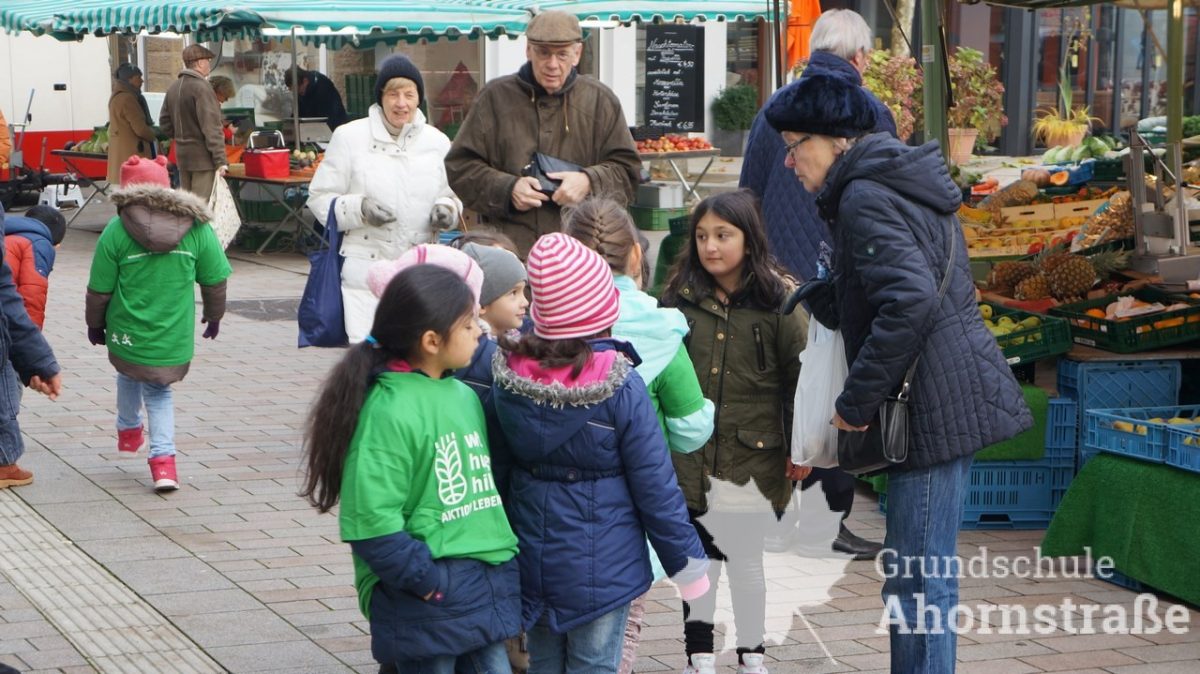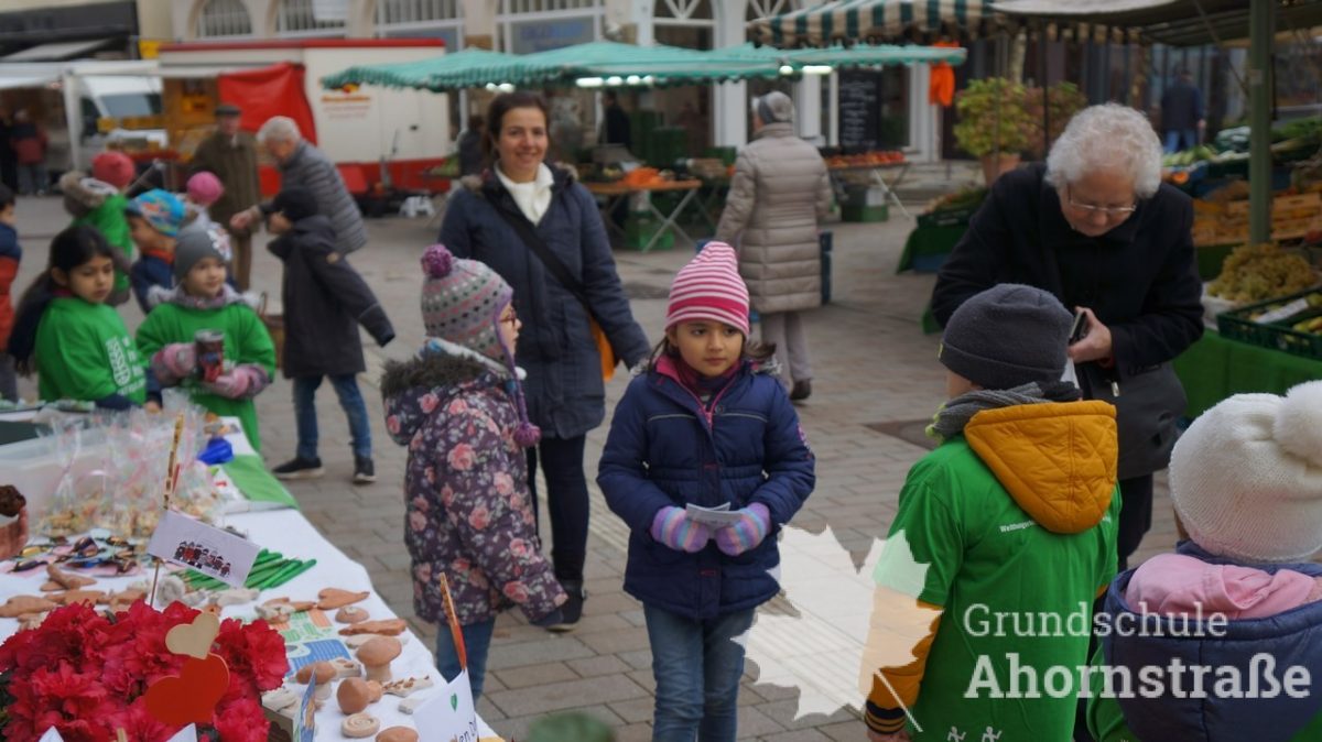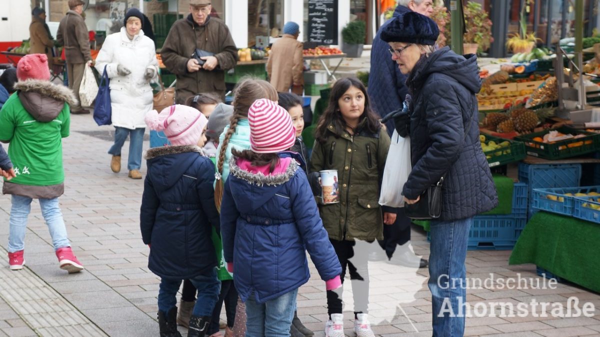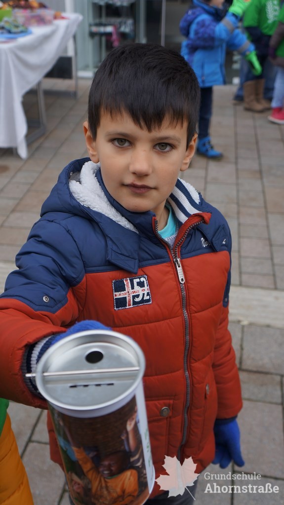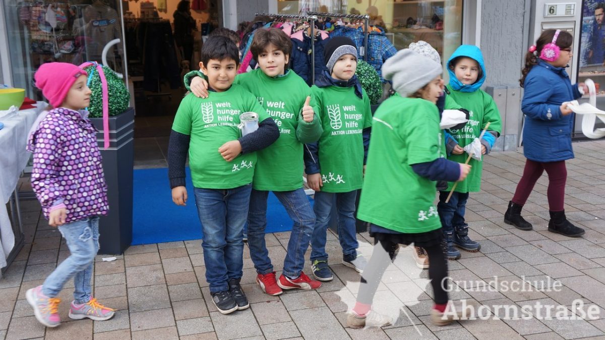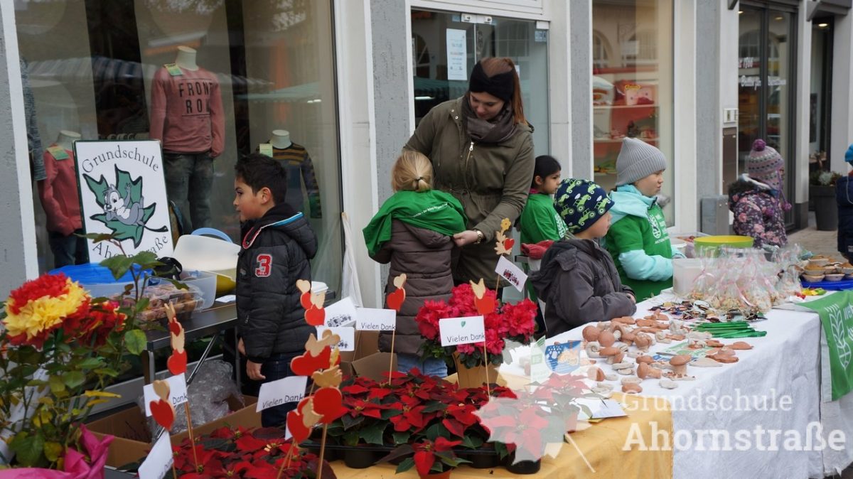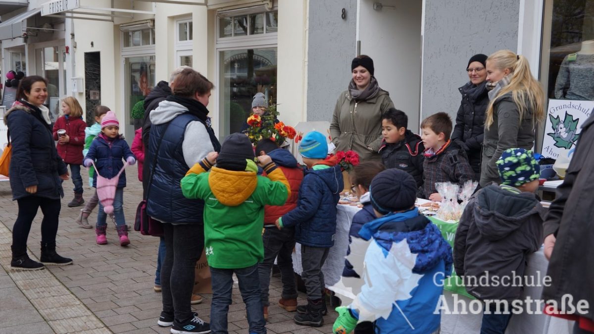Heute war es soweit: Die ersten Klassen zogen mit Blumen, Muffins, Keksen, Selbstgebasteltem und Tischen in die Stadt. Die Ahörnchen sammelten wieder einmal Spenden! Mit vorherigen Aktionen haben wir z. B. unser Zirkusprojekt oder unsere Musikanlage mit finanziert. Diesmal wollten wir etwas über den Tellerrand schauen und sammelten nicht für unsere Schule, sondern für Menschen, denen es nicht gut geht. Das Geld sollte an die Welthungerhilfe gehen, die mit ihren Spenden Lebensmittel an hungernde Menschen liefert, aber auch z.B. den Brunnenbau in wasserarmen Regionen und den Aufbau von Schulen fördert. Den Aufbau des Standes und die erste Schicht übernahm die Klasse 1a, es folgte die Ablösung durch die 1b, bis schließlich die 1c folgte, die die letzte Schicht sowie den Abbau übernahm. Vielen, vielen Dank an alle Eltern, die diese Aktion durch z.B. das Backen von Muffins oder durch die tatkräftige Unterstützung beim Spendensammeln unterstützten – jede Klasse wurde von einigen Eltern begleitet. Vielen Dank auch an Frau Flagmeier und Elena, die von 8:00 Uhr bis 12:30 Uhr in eisiger Kälte für die Kinder da waren!
