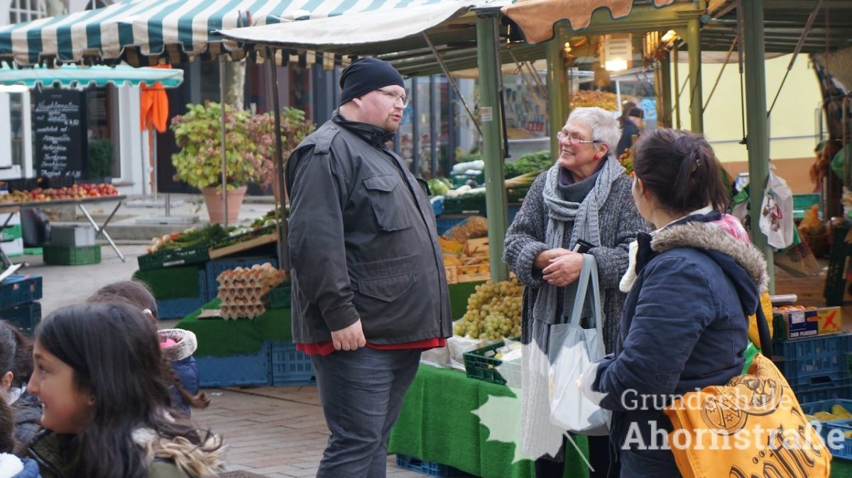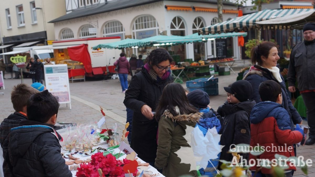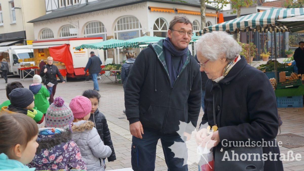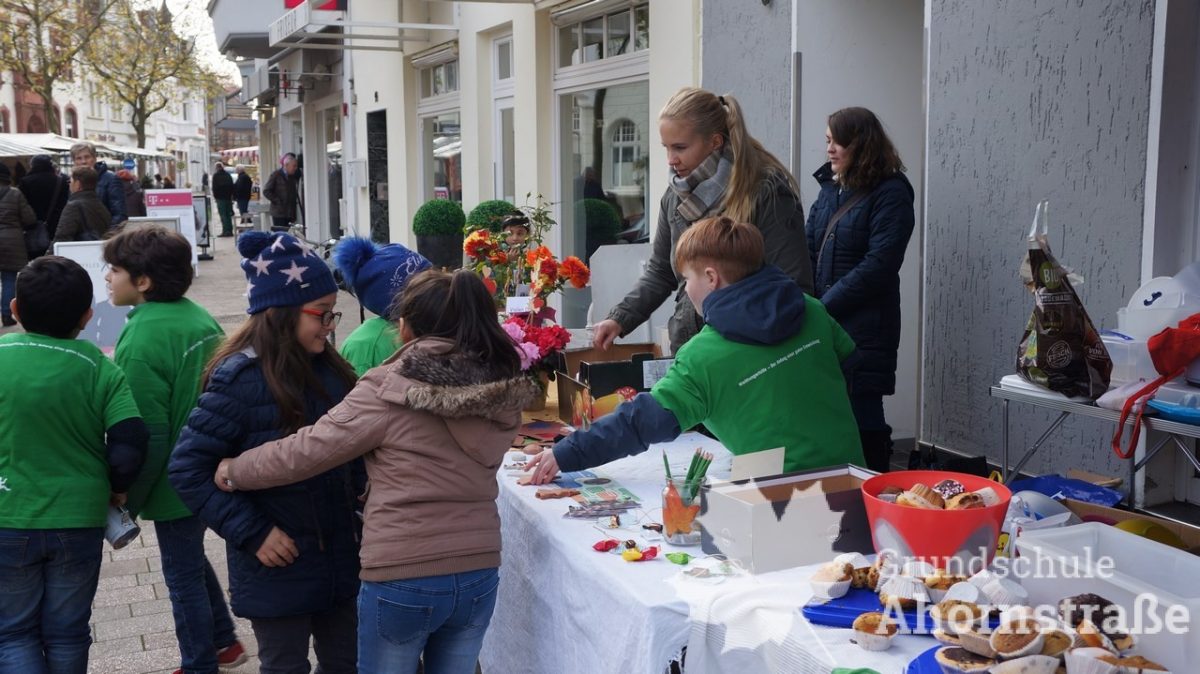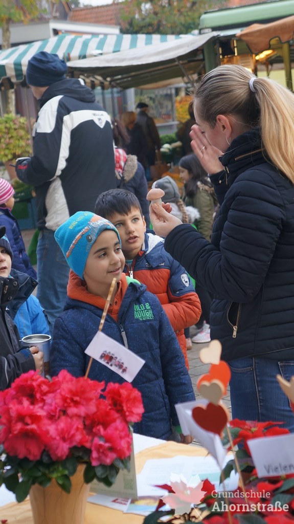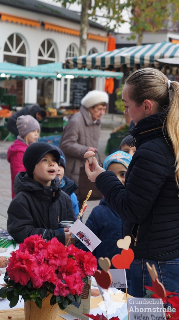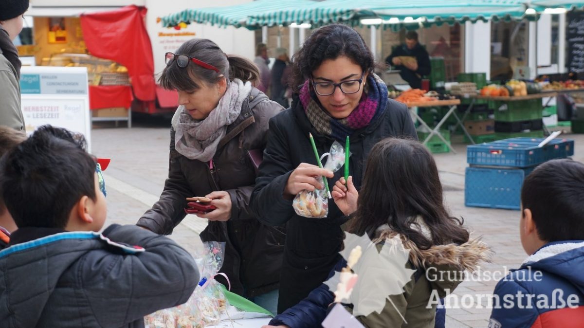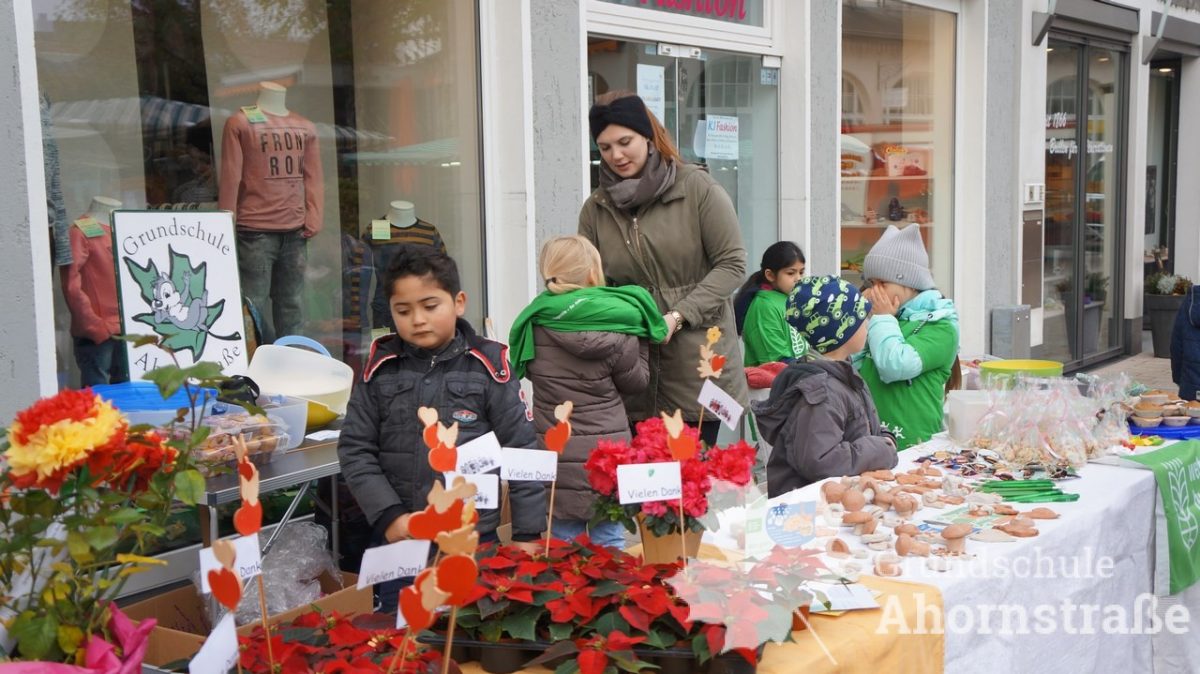 Heute war es soweit: Die ersten Klassen zogen mit Blumen, Muffins, Keksen, Selbstgebasteltem und Tischen in die Stadt. Die Ahörnchen sammelten wieder einmal Spenden! Mit vorherigen Aktionen haben wir z. B. unser Zirkusprojekt oder unsere Musikanlage mit finanziert. Diesmal wollten wir etwas über den Tellerrand schauen und sammelten nicht für unsere Schule, sondern für Menschen, denen es nicht gut geht. Das Geld sollte an die Welthungerhilfe gehen, die mit ihren Spenden Lebensmittel an hungernde Menschen liefert, aber auch z.B. den Brunnenbau in wasserarmen Regionen und den Aufbau von Schulen fördert. Den Aufbau des Standes und die erste Schicht übernahm die Klasse 1a, es folgte die Ablösung durch die 1b, bis schließlich die 1c folgte, die die letzte Schicht sowie den Abbau übernahm. Vielen, vielen Dank an alle Eltern, die diese Aktion durch z.B. das Backen von Muffins oder durch die tatkräftige Unterstützung beim Spendensammeln unterstützten – jede Klasse wurde von einigen Eltern begleitet. Vielen Dank auch an Frau Flagmeier und Elena, die von 8:00 Uhr bis 12:30 Uhr in eisiger Kälte für die Kinder da waren!