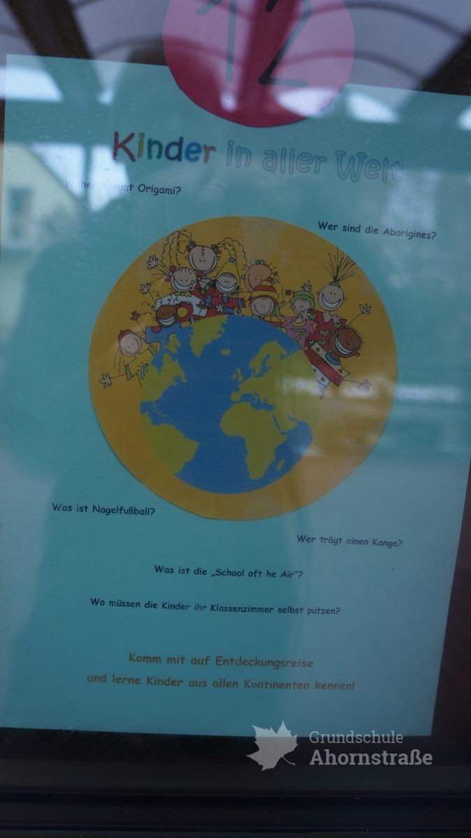 In der Woche vom 25.2 bis zum 1.3.2019 findet unsere Projektwoche „Rund um die Welt“ statt! Jede Lehrerin und jeder Lehrer hat ein Thema ausgewählt und dazu passend ein Infoplakat vorbereitet. Diese Plakate hängen nun am Fenster unseres Schulgebäudes und die Kinder müssen sich bis Mittwoch drei Themen aussuchen. Unser „Projektwochen-Team“ setzt anschließend die Gruppen zusammen. Dabei arbeiten die Kinder aus allen Klassenstufen zusammen. Hier die „Werbeplakate“: