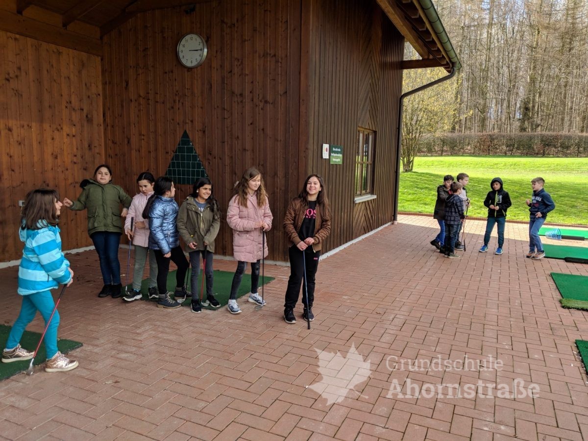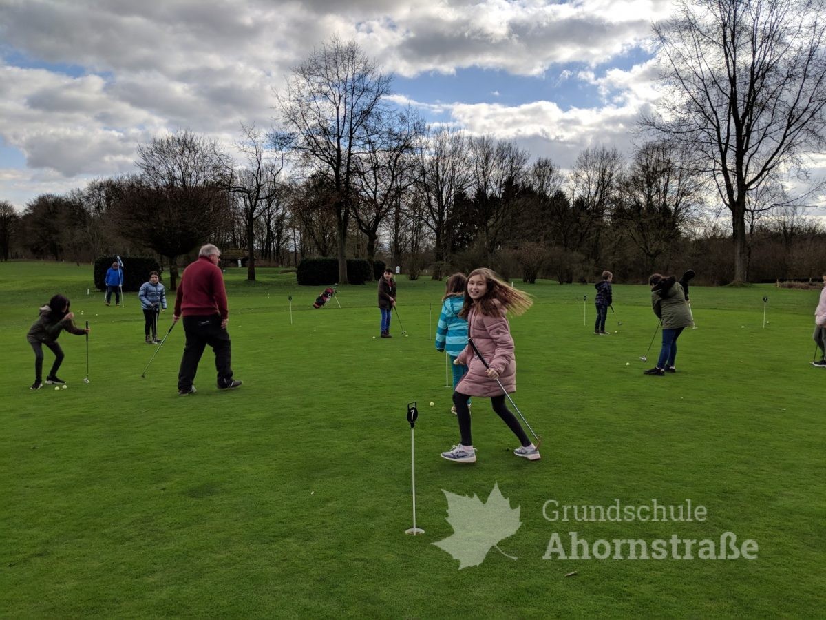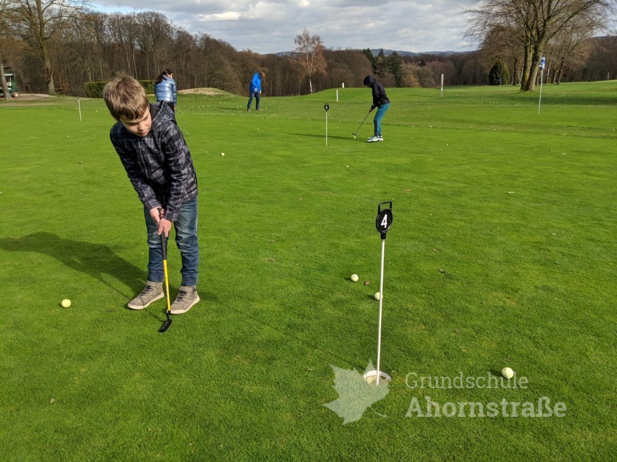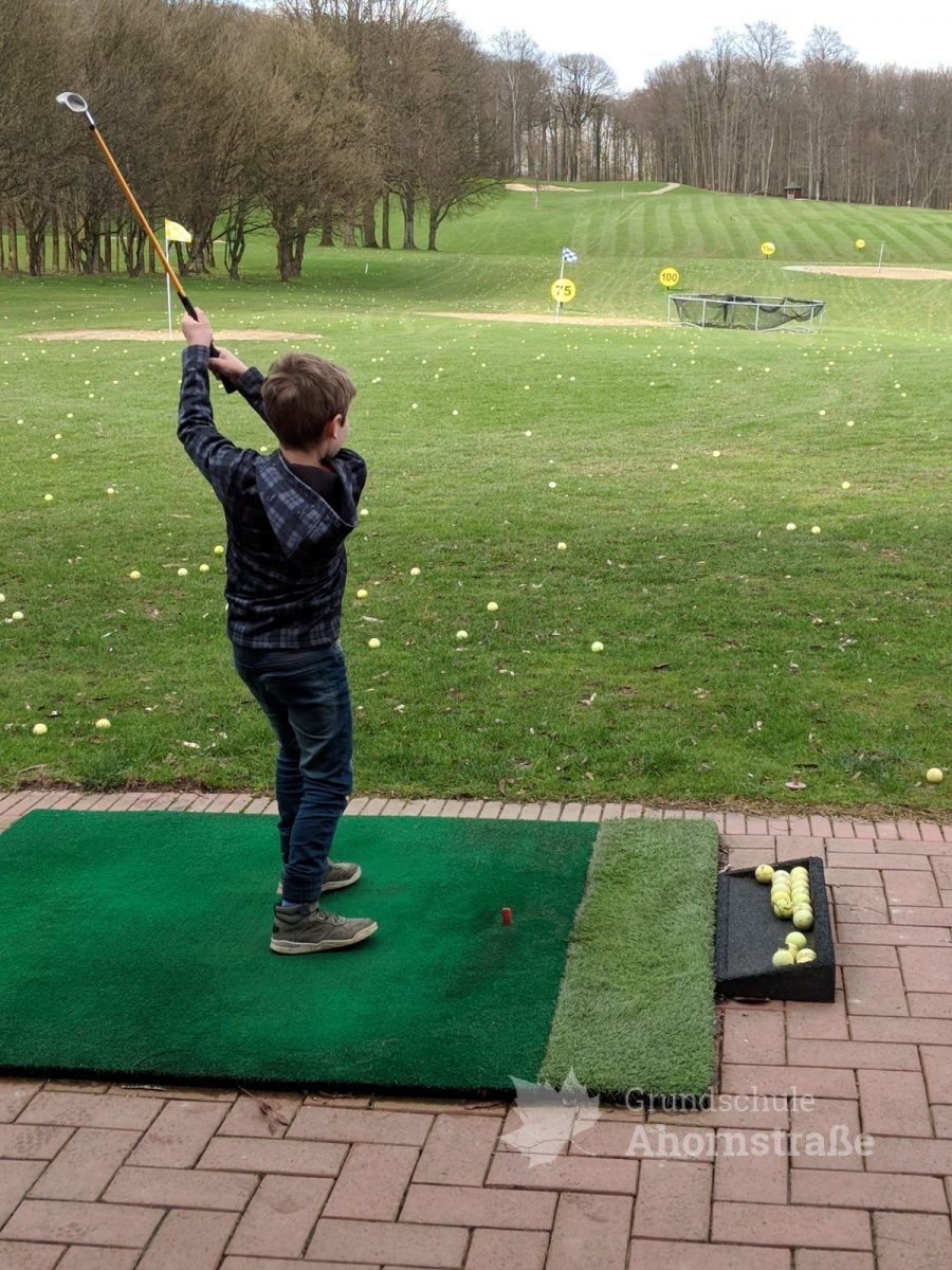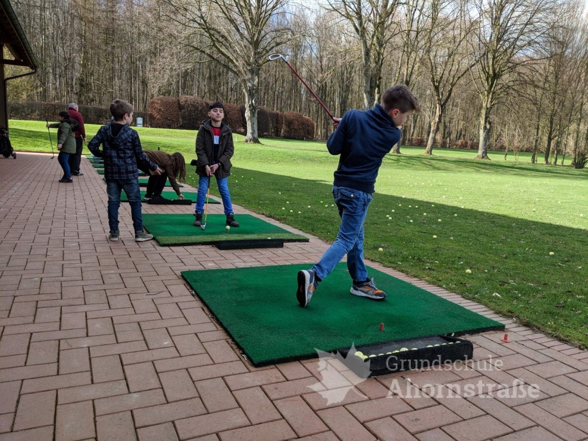 Bei schönstem Wetter konnte die Schulgolf-AG unter der Leitung von Herrn Meier auf dem Golfplatz in Bad Salzuflen beginnen. Die Kinder durften sich direkt auf dem kurzen „Putting Green“ probieren und ihre Vorkenntnisse vom Minigolf nutzen. Nach einem kleinen Wettkampf ging es dann auf die „Driving Range“, um weite Bälle zu schlagen. Mit ein paar Hilfestellungen und dem richtigen „Eisen“ flogen dann manche Bälle schon weit über 20 Meter. Wir bedanken uns bei unserem Golftrainer Neil Bryan für den spannenden Nachmittag und freuen uns schon auf die folgenden Termine.