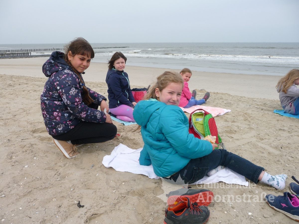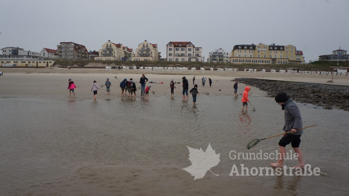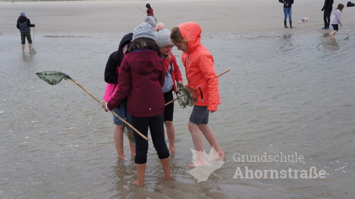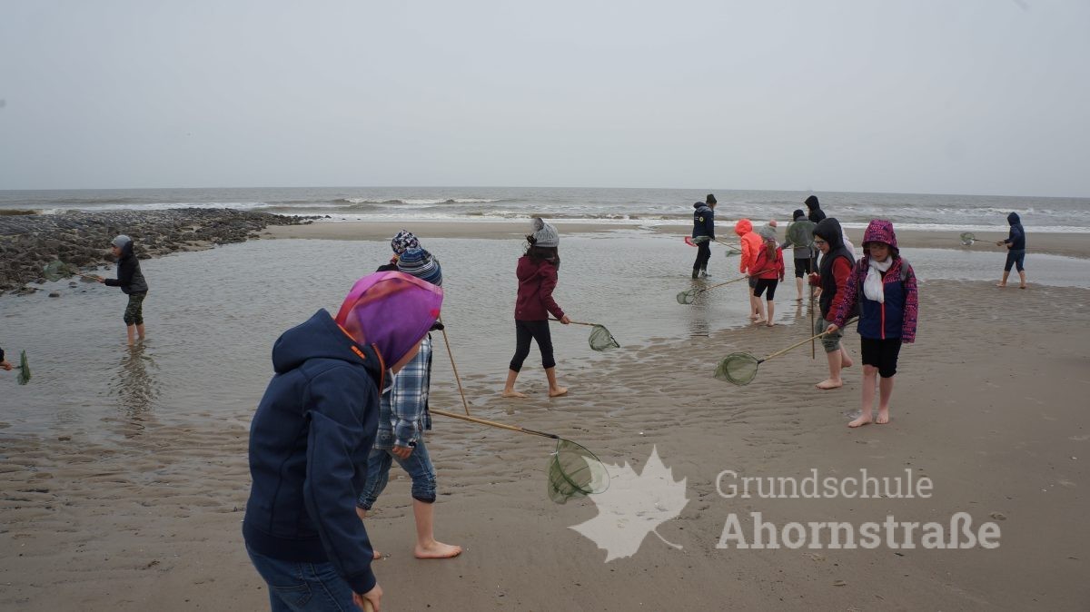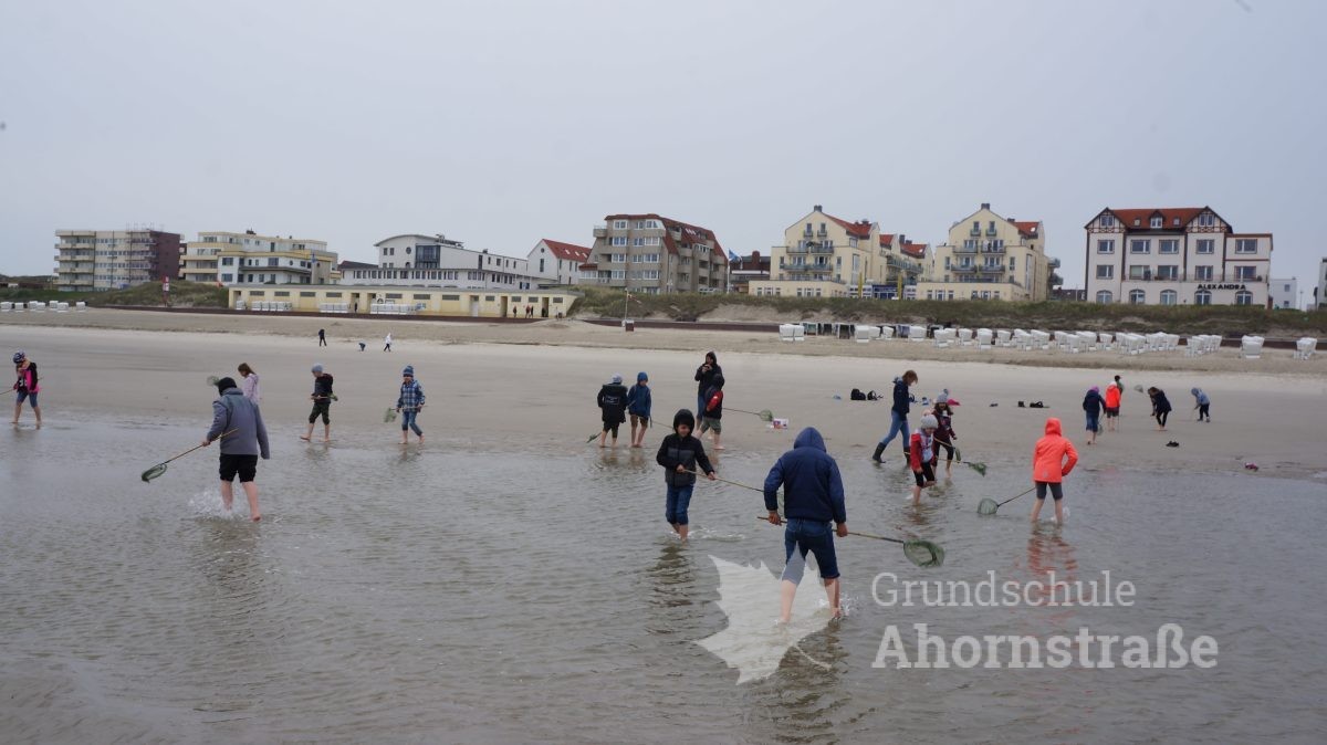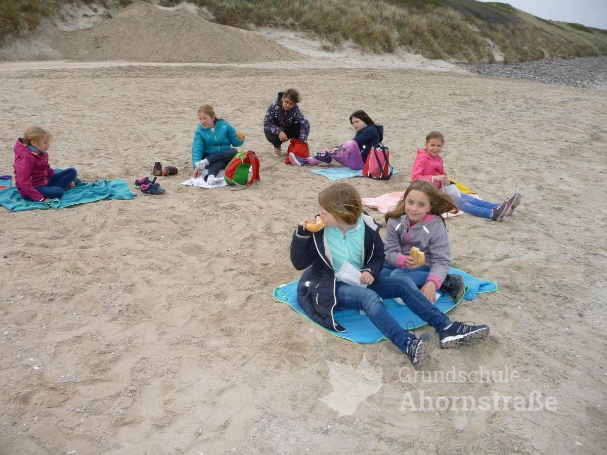 Heute machte sich die 3c auf in die Nationalparkstation Wattenmeer zum Kescherbau. Unter fachmännischer und freundlicher Anleitung bastelten sich die Kinder einen eigenen Kescher mit dem sie sich anschließend auf die Suche nach Meerestieren machten. Sie lernten einiges, zum Beispiel, dass die Schwertmuschel vor vielen Jahren aus Amerika von Frachtschiffen in únsere Nordsee eingeführt wurde. Morgen nimmt die 3b an diesem Programm teil. Mal sehen, was sie so finden! Heute picknickte die Klasse 3b ausgiebig am Strand! Am Nachmittag nutzen alle Kinder die Spielmöglichkeiten im und am Haus: Kicker, Tischtennis, Bolzplatz und Abenteuerspielplatz. Nach dem Abendessen blieben einige Kinder im Gruppenraum und machten Spiele, während die anderen sich auf einen langen Abendspaziergang am Meer entlang auf machten. Für große Aufregung sorgte dabei ein mächtig großer Krebs, den wir zunächst für einen Stein hielten, der uns dann aber seine riesigen Scheren entgegen streckte. Wir ließen ihn in Ruhe, so dass er sich wieder eingraben konnte. Wir freuen uns alle auf den nächsten Tag!