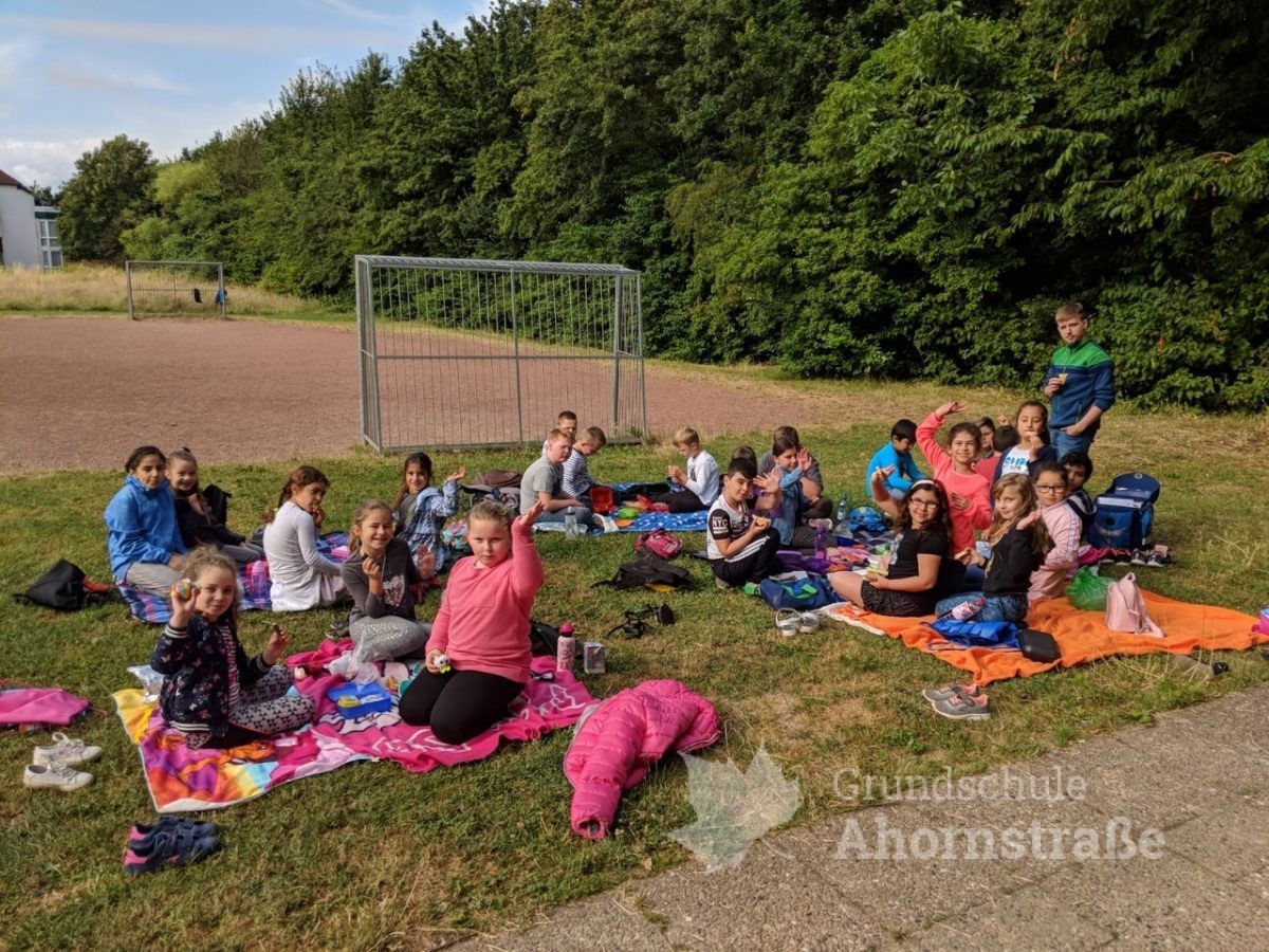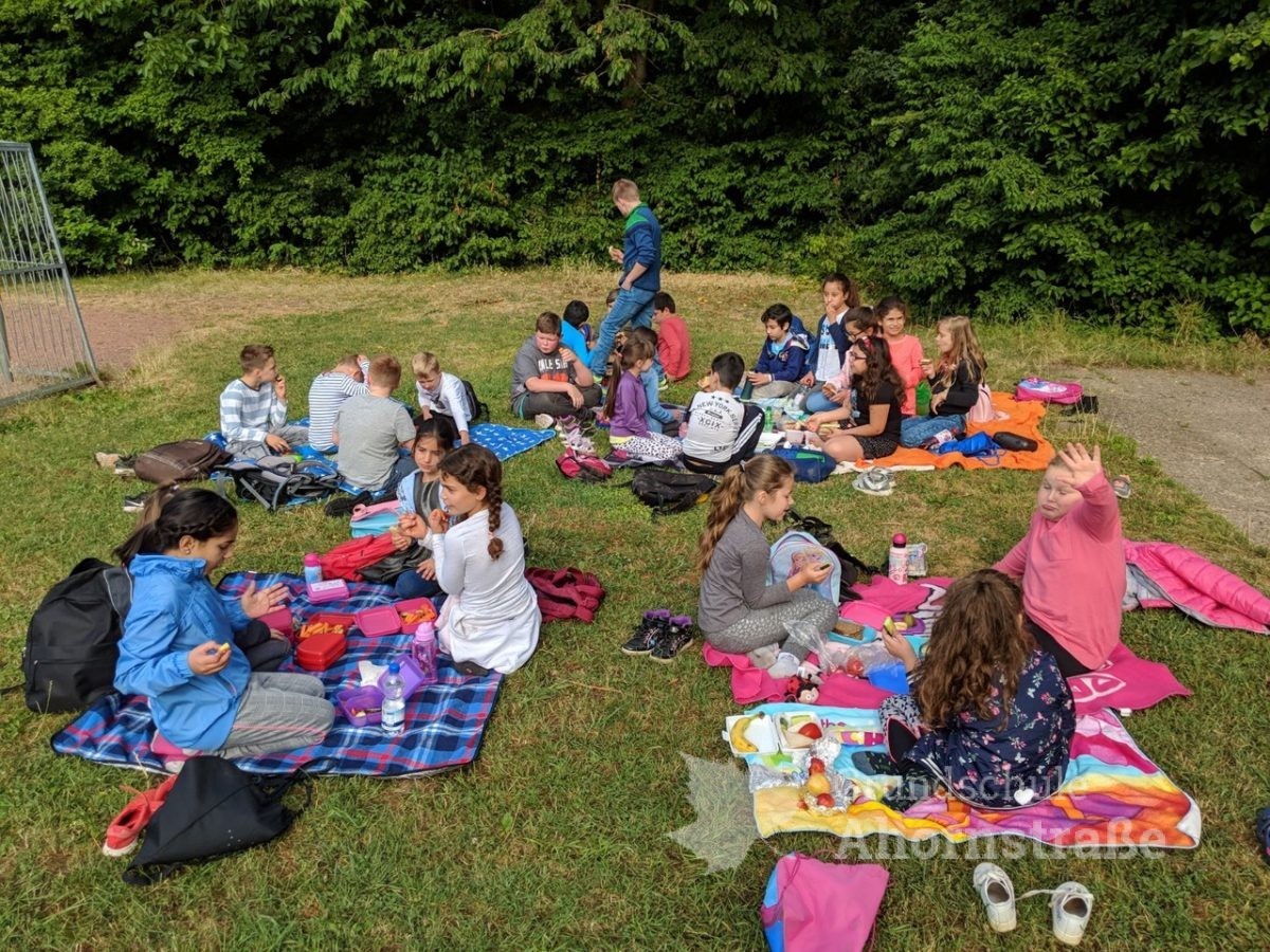 Die Klasse 2c machte heute einen Ausflug zum Spielplatz an der Beetstraße. Bei strahlendem Sonnenschein konnten die Kinder schaukeln, klettern, rutschen, Fußball spielen und vieles mehr. Nachdem der erste Bewegungsdrang gestillt war, holten die Kinder ihre Decken sowie ihr gesundes Frühstück heraus und wir frühstückten gemeinsam auf der Wiese. Es gab sehr viel geschnittenes Gemüse, Obstspieße, gebackenen Blätterteig, Sesamstangen und ungesüßte Getränke. Vielen Dank an die Elternschaft für das Backen, Schneiden und Mitgeben der Leckereien.
