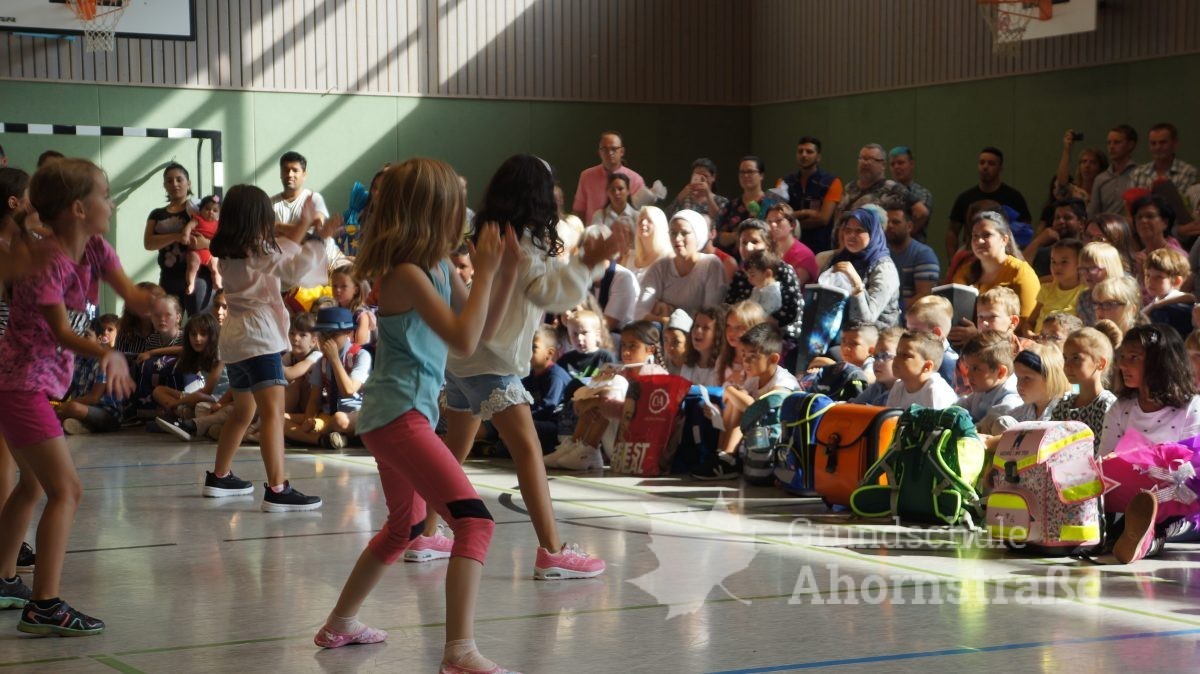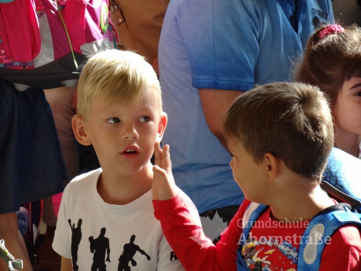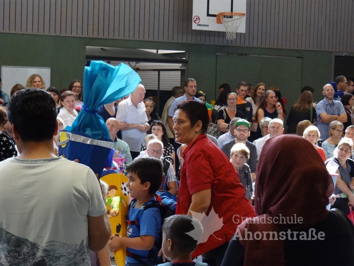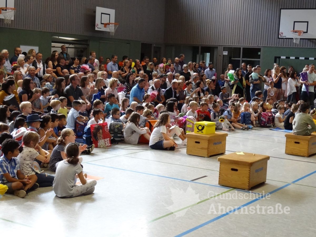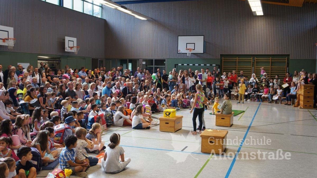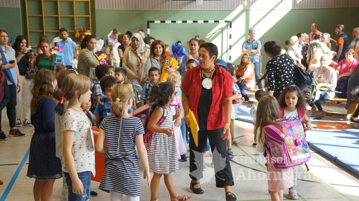 Heute war es für unsere neuen Erstklässlerinnen und Erstklässler soweit: Ihr erster Schultag an der Grundschule Ahornstraße! In der Turnhalle begrüßte Frau Daubel-Wiele alle Anwesende und erläuterte den Verlauf des Vormittages. Traditionell haben die dritten Klassen unserer Schule extra für diesen Tag ein kleines Programm vorgeführt: Die Klassen 3b führte das Stück vom „Löwen, der nicht lesen konnte“ vor, die 3a zeigte Akrobatik und einen Tanz und die Klasse 3c überzeugte durch den Anlaut-RAP, bei dem die Kinder ausgesprochen viel Text auswendig vorsingen konnten. Nach der Aufführung scharten sich unsere neuen Schülerinnen und Schüler um ihre Klassenlehrerinnen Frau Bush mit Frau Lohmann, Frau Steinhoff und Frau Vietmeyer, denn jetzt ging es in die Klassenräume. Derweil konnten sich die Eltern auf dem Schulhof bei Kaffee und Kuchen austauschen. Die zweiten Klassen hatten den Kuchen bereit gestellt und der Förderverein unter der Leitung von Frau Sala sorgte für die Bewirtung. Die folgenden Bilder zeigen, dass die Stimmung heute ausgezeichnet war: