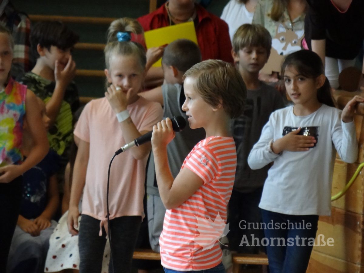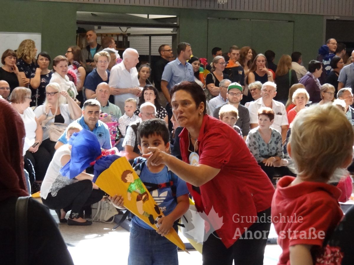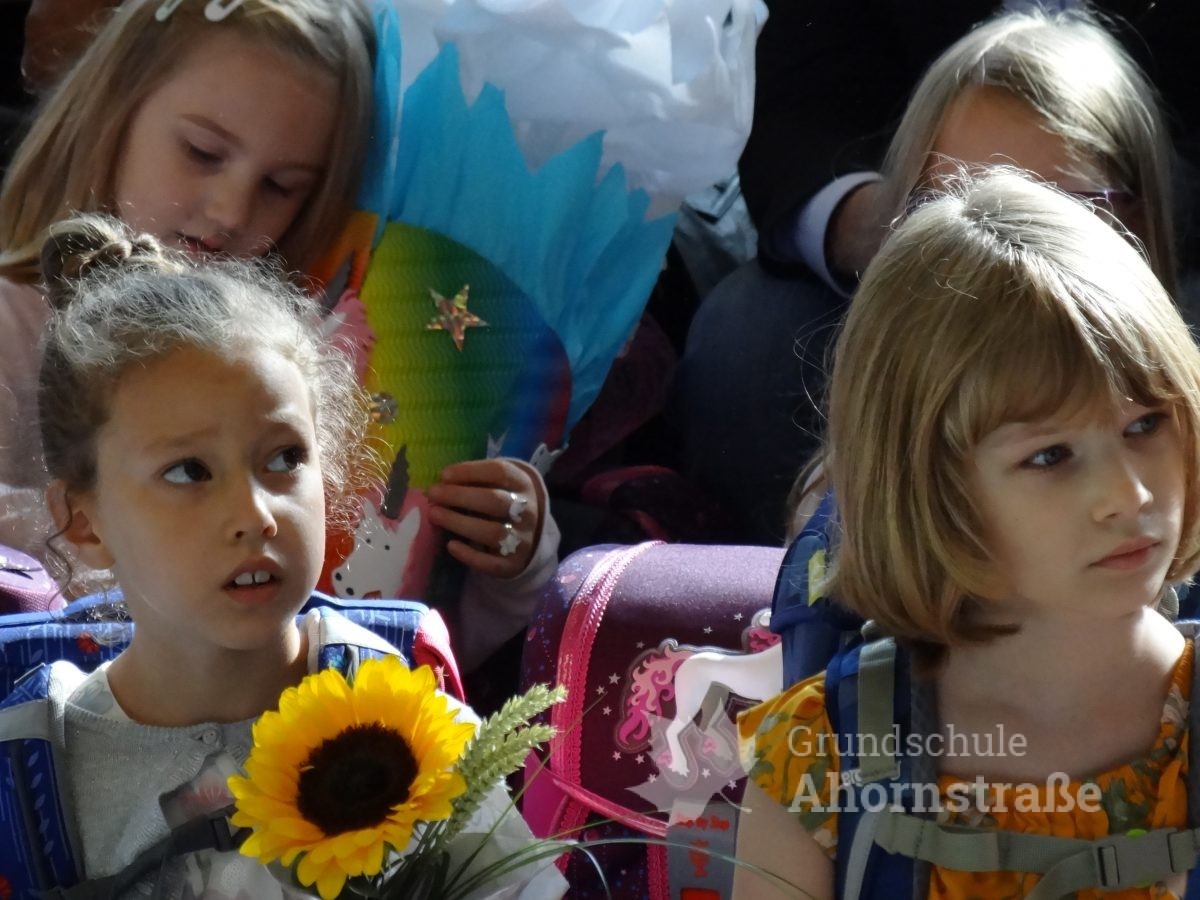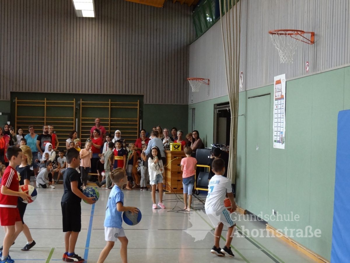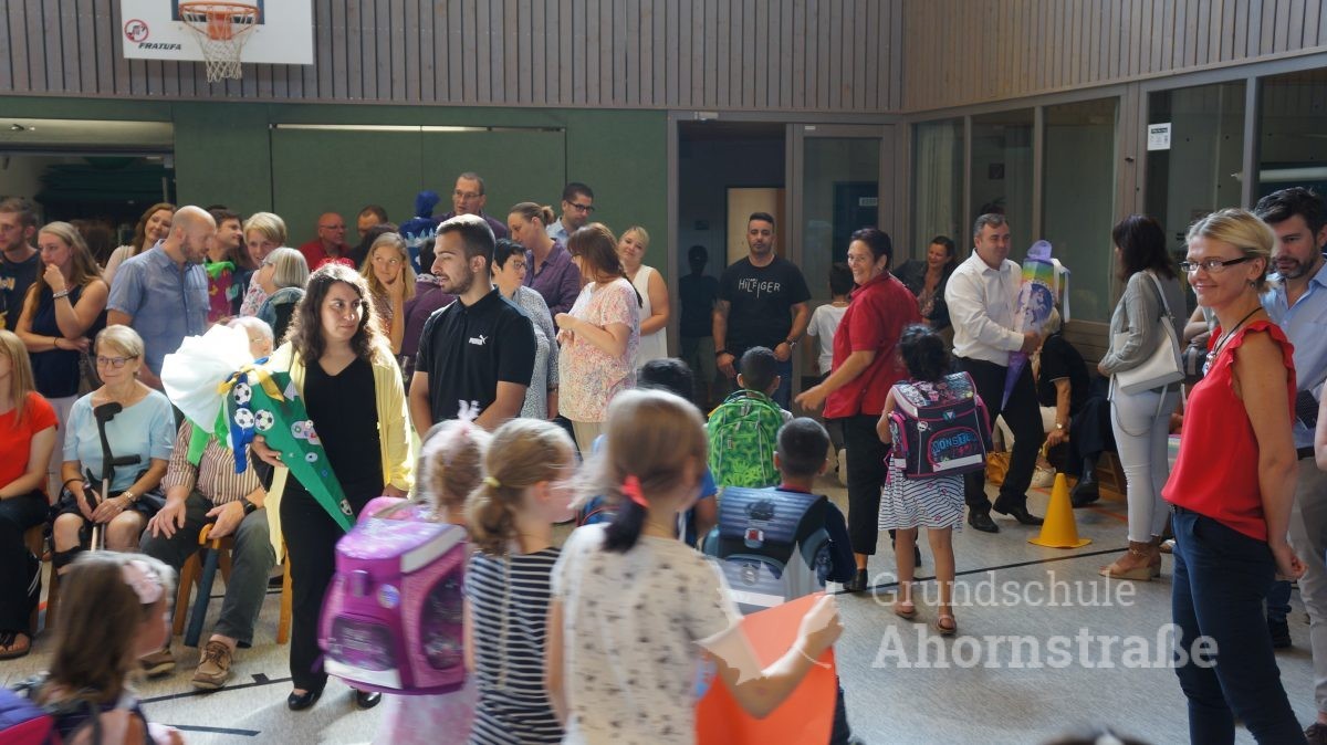 Heute war es für unsere neuen Erstklässlerinnen und Erstklässler soweit: Ihr erster Schultag an der Grundschule Ahornstraße! In der Turnhalle begrüßte Frau Daubel-Wiele alle Anwesende und erläuterte den Verlauf des Vormittages. Traditionell haben die dritten Klassen unserer Schule extra für diesen Tag ein kleines Programm vorgeführt: Die Klassen 3b führte das Stück vom „Löwen, der nicht lesen konnte“ vor, die 3a zeigte Akrobatik und einen Tanz und die Klasse 3c überzeugte durch den Anlaut-RAP, bei dem die Kinder ausgesprochen viel Text auswendig vorsingen konnten. Nach der Aufführung scharten sich unsere neuen Schülerinnen und Schüler um ihre Klassenlehrerinnen Frau Bush mit Frau Lohmann, Frau Steinhoff und Frau Vietmeyer, denn jetzt ging es in die Klassenräume. Derweil konnten sich die Eltern auf dem Schulhof bei Kaffee und Kuchen austauschen. Die zweiten Klassen hatten den Kuchen bereit gestellt und der Förderverein unter der Leitung von Frau Sala sorgte für die Bewirtung. Die folgenden Bilder zeigen, dass die Stimmung heute ausgezeichnet war: