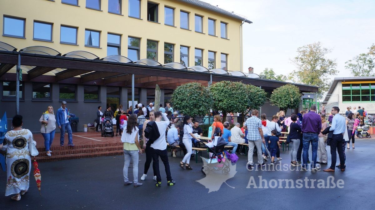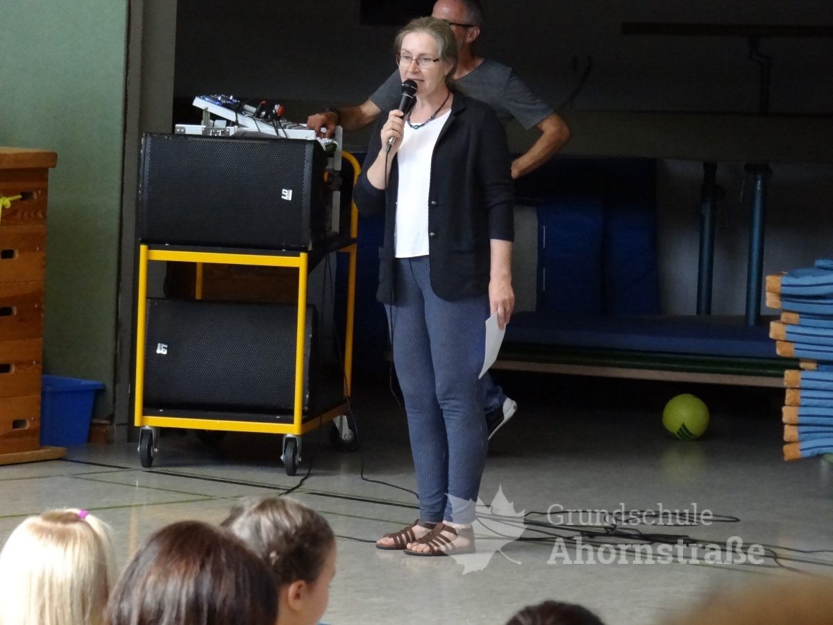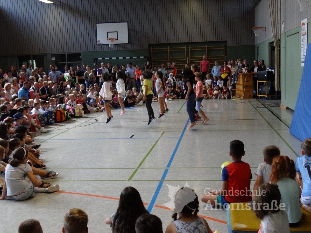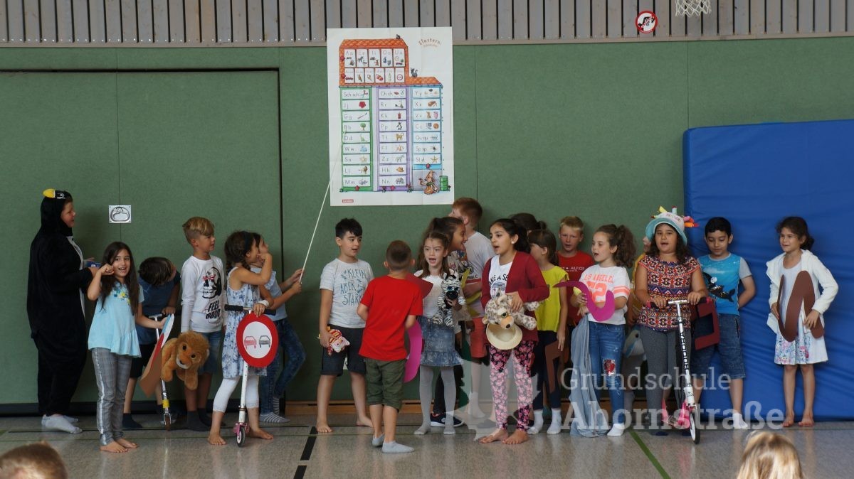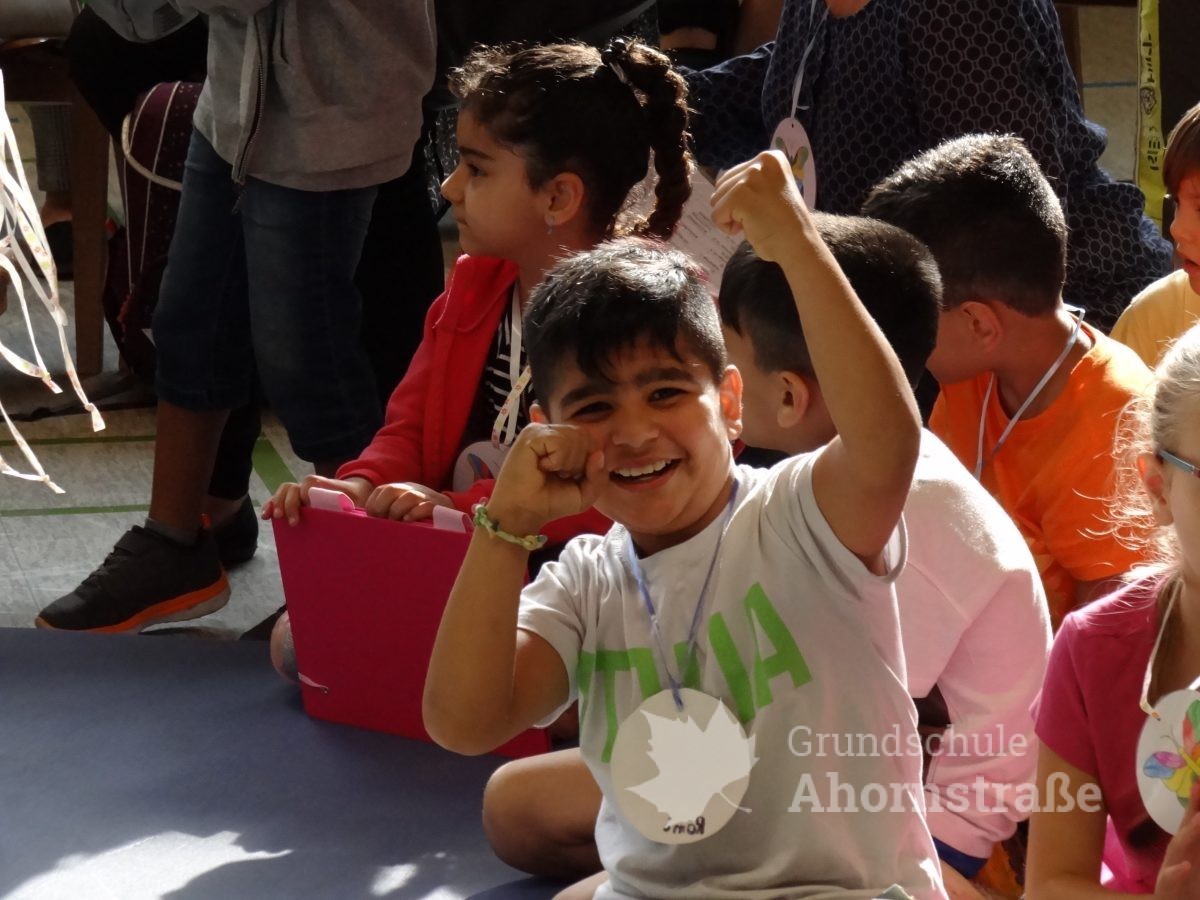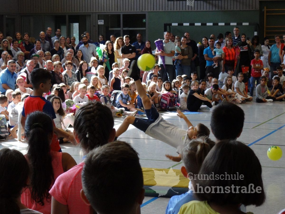 Heute war es für unsere neuen Erstklässlerinnen und Erstklässler soweit: Ihr erster Schultag an der Grundschule Ahornstraße! In der Turnhalle begrüßte Frau Daubel-Wiele alle Anwesende und erläuterte den Verlauf des Vormittages. Traditionell haben die dritten Klassen unserer Schule extra für diesen Tag ein kleines Programm vorgeführt: Die Klassen 3b führte das Stück vom „Löwen, der nicht lesen konnte“ vor, die 3a zeigte Akrobatik und einen Tanz und die Klasse 3c überzeugte durch den Anlaut-RAP, bei dem die Kinder ausgesprochen viel Text auswendig vorsingen konnten. Nach der Aufführung scharten sich unsere neuen Schülerinnen und Schüler um ihre Klassenlehrerinnen Frau Bush mit Frau Lohmann, Frau Steinhoff und Frau Vietmeyer, denn jetzt ging es in die Klassenräume. Derweil konnten sich die Eltern auf dem Schulhof bei Kaffee und Kuchen austauschen. Die zweiten Klassen hatten den Kuchen bereit gestellt und der Förderverein unter der Leitung von Frau Sala sorgte für die Bewirtung. Die folgenden Bilder zeigen, dass die Stimmung heute ausgezeichnet war: