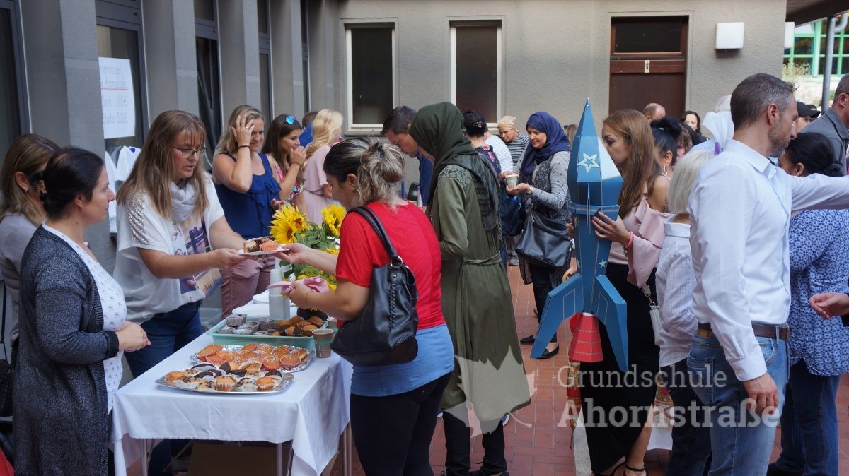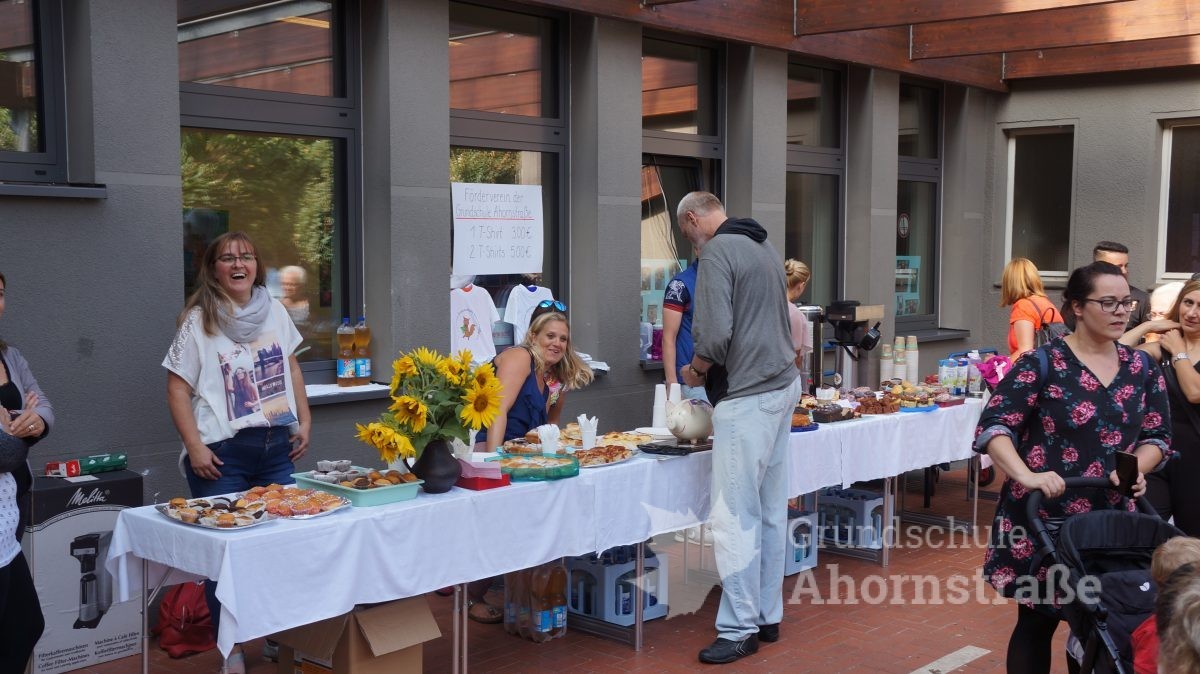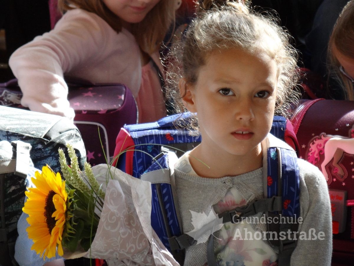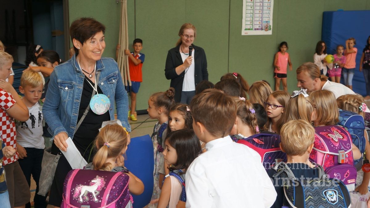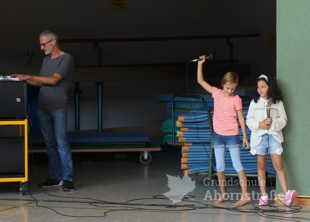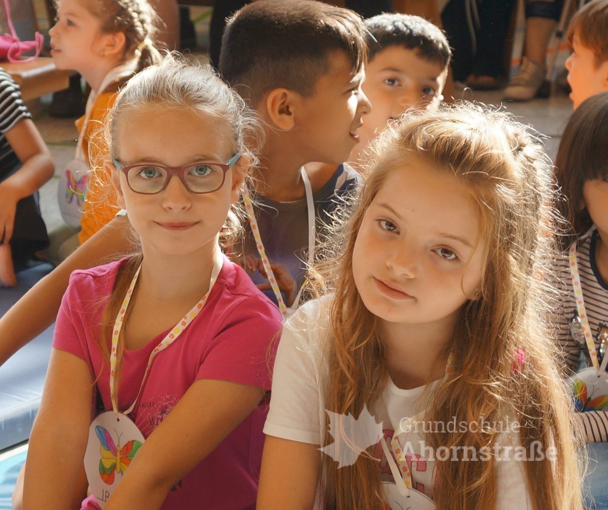 Heute war es für unsere neuen Erstklässlerinnen und Erstklässler soweit: Ihr erster Schultag an der Grundschule Ahornstraße! In der Turnhalle begrüßte Frau Daubel-Wiele alle Anwesende und erläuterte den Verlauf des Vormittages. Traditionell haben die dritten Klassen unserer Schule extra für diesen Tag ein kleines Programm vorgeführt: Die Klassen 3b führte das Stück vom „Löwen, der nicht lesen konnte“ vor, die 3a zeigte Akrobatik und einen Tanz und die Klasse 3c überzeugte durch den Anlaut-RAP, bei dem die Kinder ausgesprochen viel Text auswendig vorsingen konnten. Nach der Aufführung scharten sich unsere neuen Schülerinnen und Schüler um ihre Klassenlehrerinnen Frau Bush mit Frau Lohmann, Frau Steinhoff und Frau Vietmeyer, denn jetzt ging es in die Klassenräume. Derweil konnten sich die Eltern auf dem Schulhof bei Kaffee und Kuchen austauschen. Die zweiten Klassen hatten den Kuchen bereit gestellt und der Förderverein unter der Leitung von Frau Sala sorgte für die Bewirtung. Die folgenden Bilder zeigen, dass die Stimmung heute ausgezeichnet war: