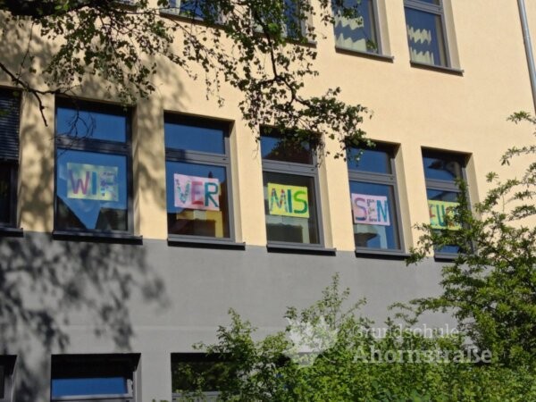 Heute überraschten uns die Lehrerinnen und die Kinder mit einem kleinen Satz, der uns allen aus dem Herzen spricht: „Wir vermissen euch!“ steht in großen Buchstaben an den Fenstern des leeren Lehrerzimmers. Wer an der Ahornstraße entlang geht, kann ihn sehen. Eine tolle Idee!