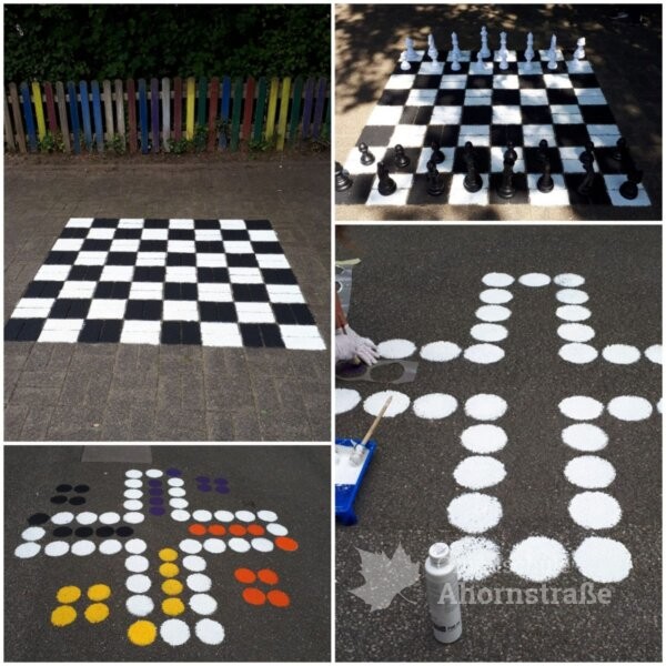 – großes Schachbrett und „Mensch ärgere dich nicht“-Spiel auf den Schulhof malen und Figuren dafür gestaltet