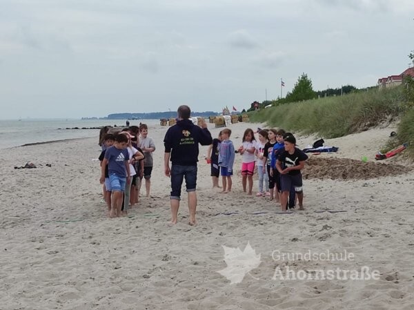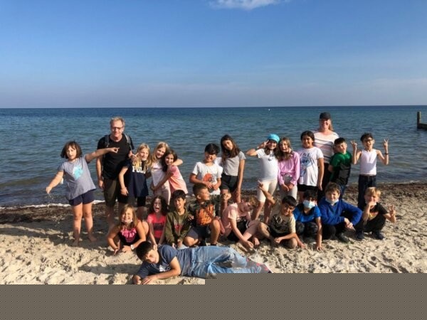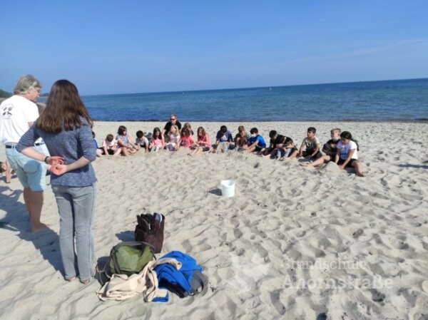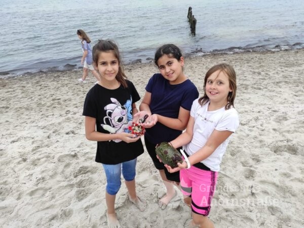 Die Nacht verlief ruhig und am nächsten Morgen waren alle gespannt, welche Unternehmungen am Dienstag anstanden. Mit einem Bus ging es nämlich in das Nachbardorf „Kellenhusen“. Dort gab es eine naturkundliche Führung am Strand, die vom „Haus der Natur“ organisiert wurde. Der Referent erklärte viel über verschiedene Möwenarten oder die unterschiedlichen Lebewesen im Meer. Die Kinder durften auch selbst einmal auf die Suche nach besonderen Fundstücken gehen und abschließend einen echten Bernstein in den Händen halten. Abends machte die Pinguinklasse eine Leserallye im Haus. Mit dem richtigen Lösungswort konnte man in der Schatzkiste ein Leuchtarmband finden, mit dem sich dann alle auf die Nachtwanderung begaben.