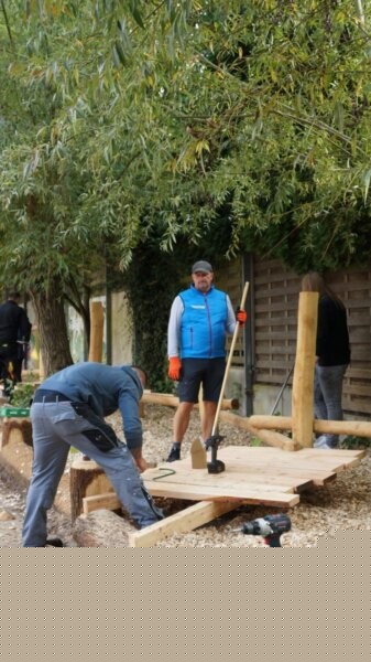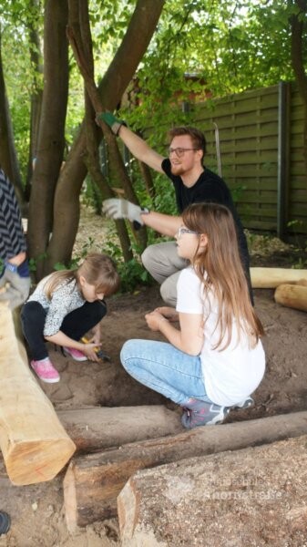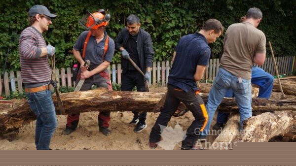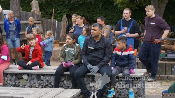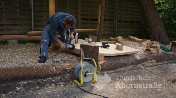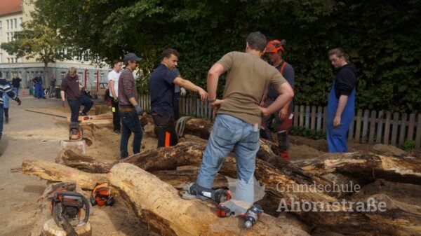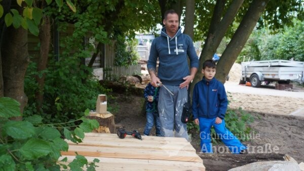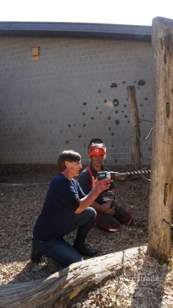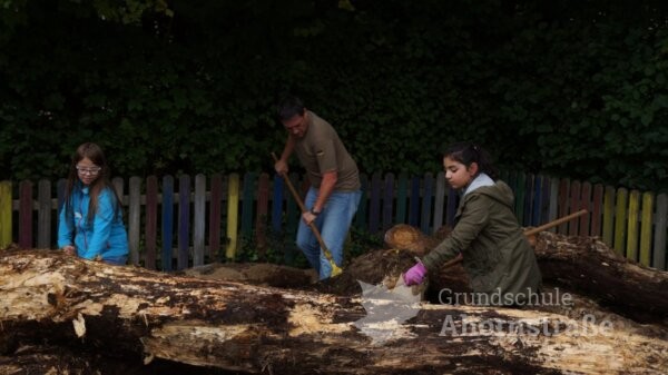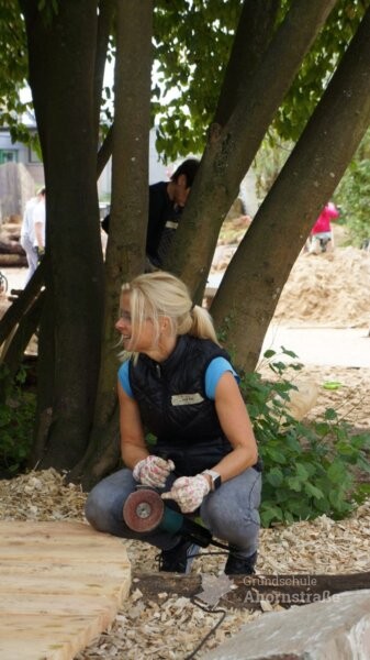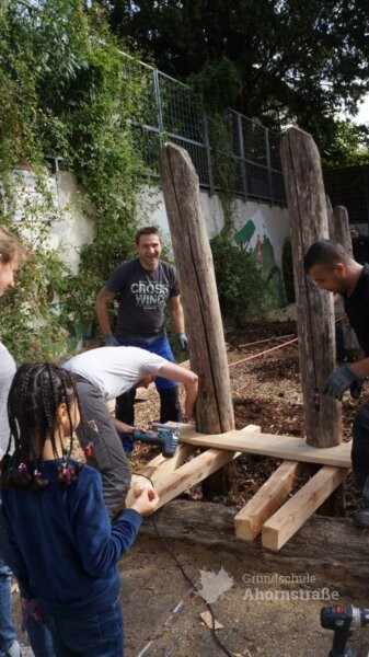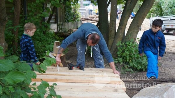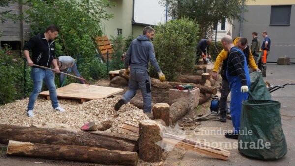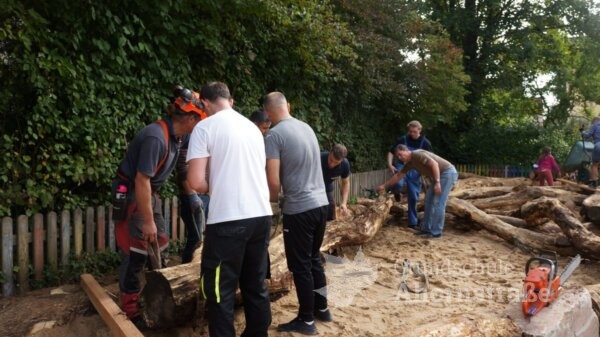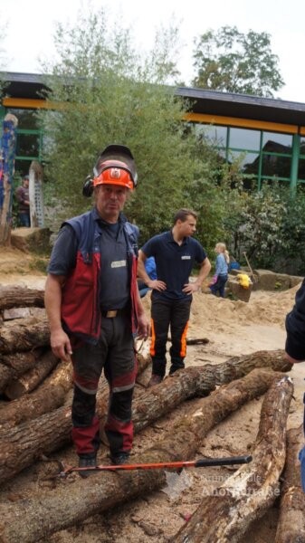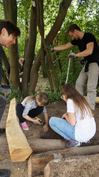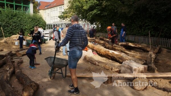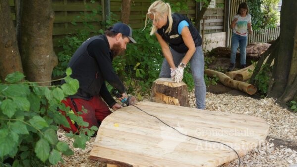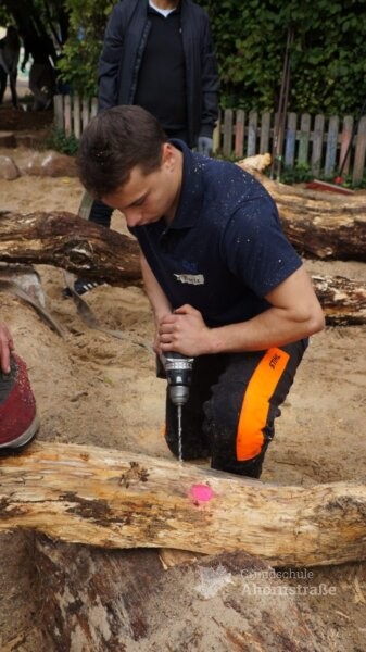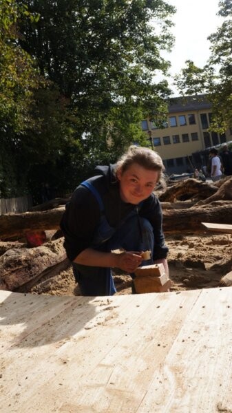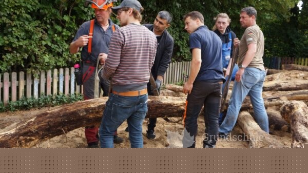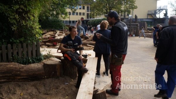 Heute ging es weiter! Ab neun Uhr kreischten erneut die Motorsägen auf dem Schulhof unserer Schule und viele fleißige Erwachsenen- und Kinderhände trugen Baumstämme, zimmerten Holzpodeste, stabilisierten lockere Holzstämme, verteilten Holzschnitzel und und und…