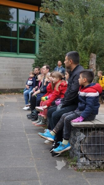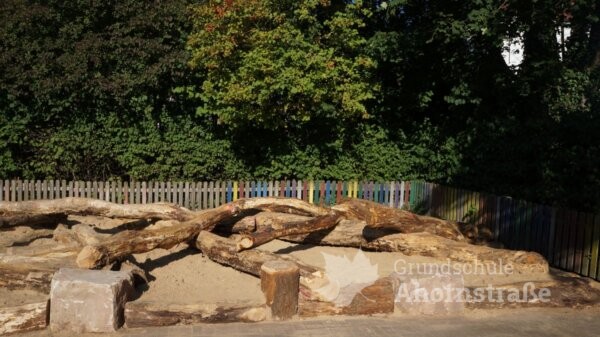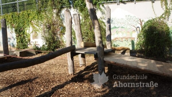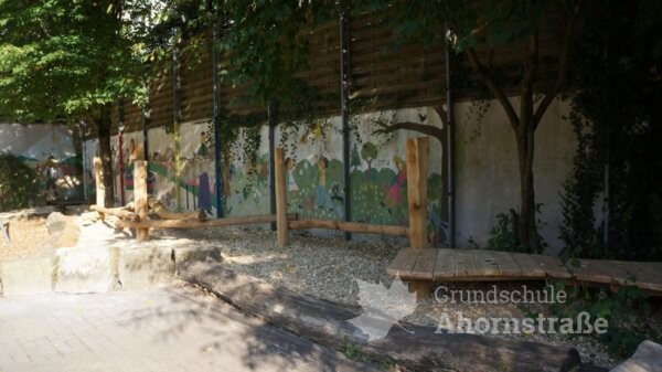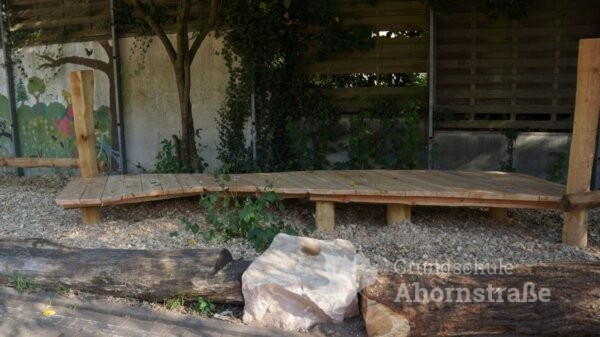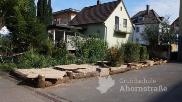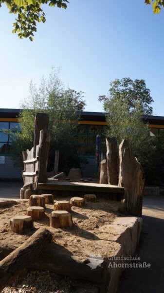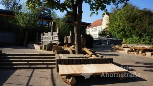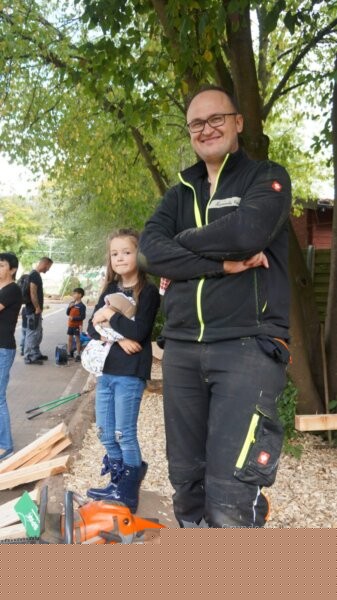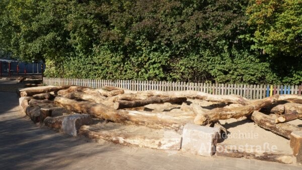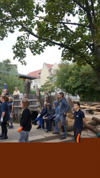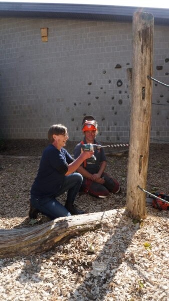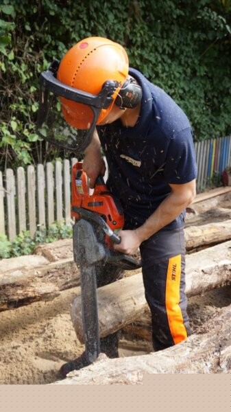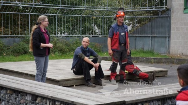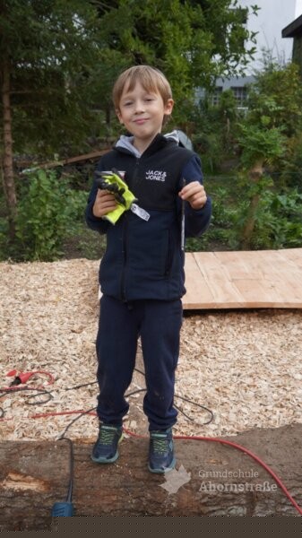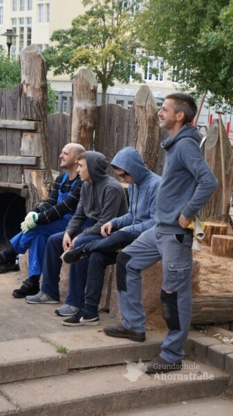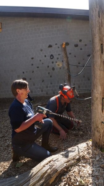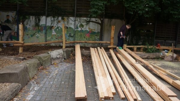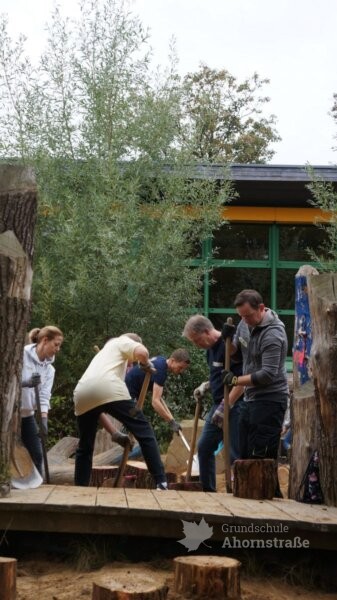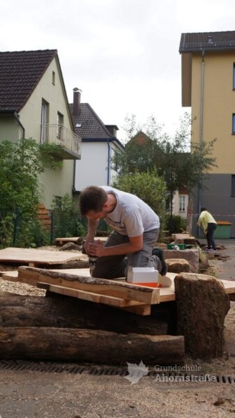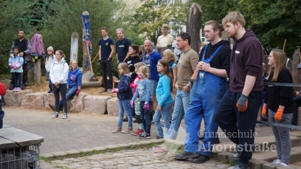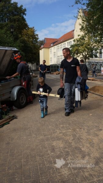 Heute ging es weiter! Ab neun Uhr kreischten erneut die Motorsägen auf dem Schulhof unserer Schule und viele fleißige Erwachsenen- und Kinderhände trugen Baumstämme, zimmerten Holzpodeste, stabilisierten lockere Holzstämme, verteilten Holzschnitzel und und und…