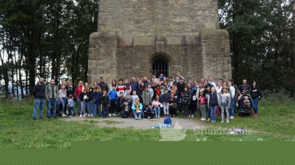Am vergangenen Freitag (1.10.21) machten sich die Kinder der Klasse 1a mit ihren Eltern, Geschwistern und Angehörigen auf den Weg zum Bismarckturm bei Wüsten. Besonders tapfer waren die Mütter und Väter mit den Kindernwagen, die beim Aufstieg und Abstieg durch den Wald sehr zu kämpfen hatten. Da wir uns vorher den Schlüssel für den Aufgang zum Turm besorgt hatten, war es auch möglich, die Plattform zu betreten und die Aussicht zu genießen.