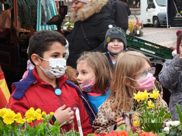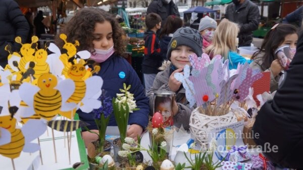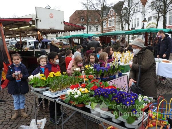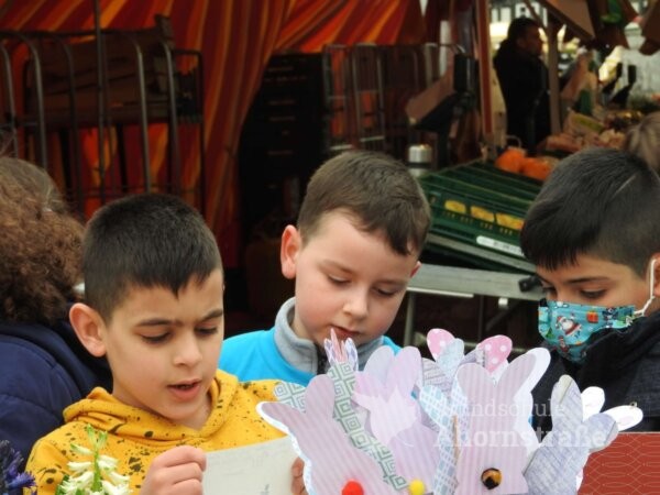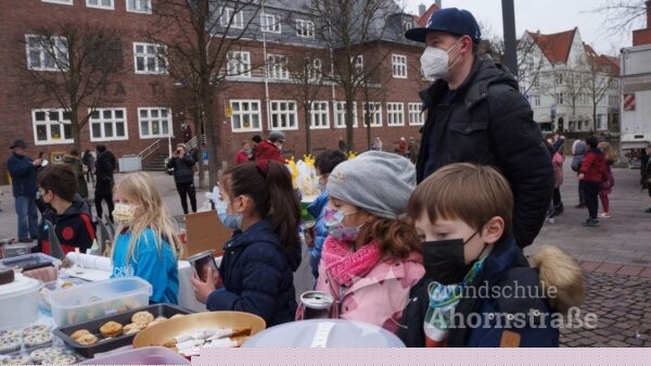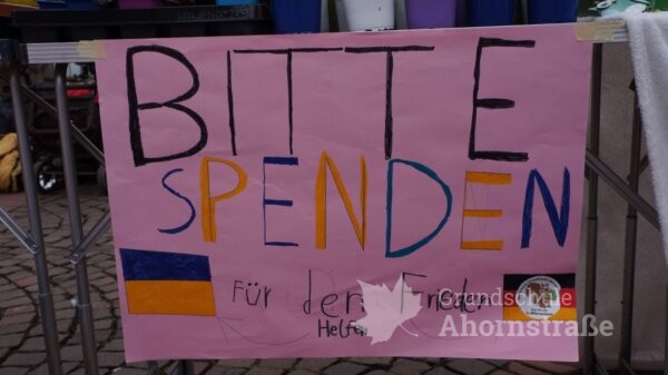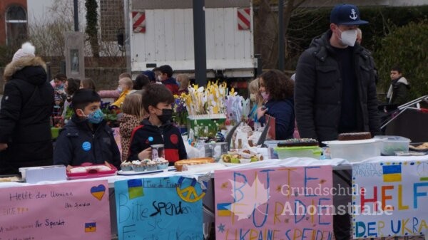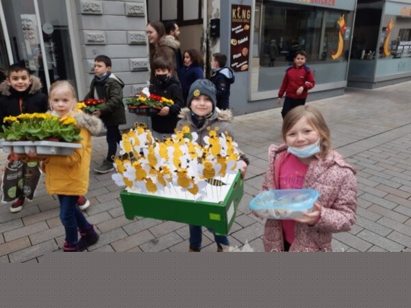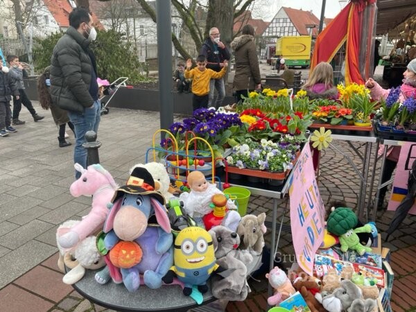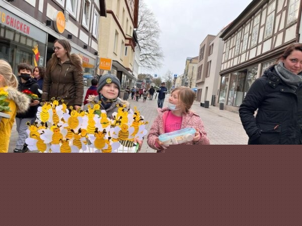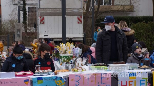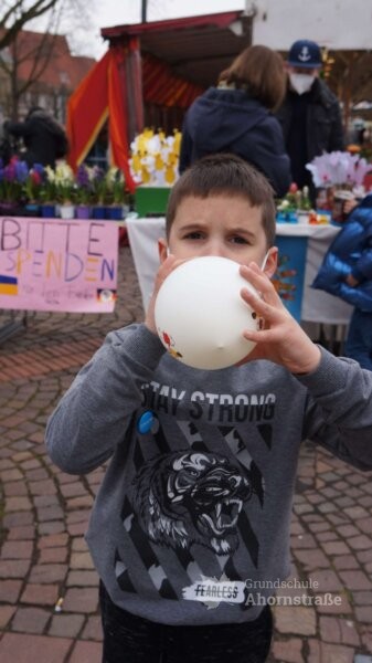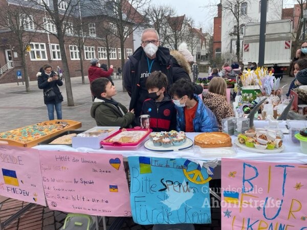 Heute bauten wir zum ersten Mal unseren Spendenstand für UNICEF in der Stadt am Marktplatz auf. Die Kinder der ersten Klassen unserer Schule sammelten für die Flüchtlingshilfe für die Menschen aus der Ukraine fleißig Spenden. Viele Eltern haben Kuchen gebacken und die Kinder haben in der Schule fleißig gebastelt und gemalt. Die „großen“ Kinder aus den vierten Klassen haben für uns Flyer und Plakate gemalt und einige Gärtnereien aus Bad Salzuflen und der Umgebung spendeten uns zahlreiche Blumen, die wir gegen eine Geldspende abgeben konnten.