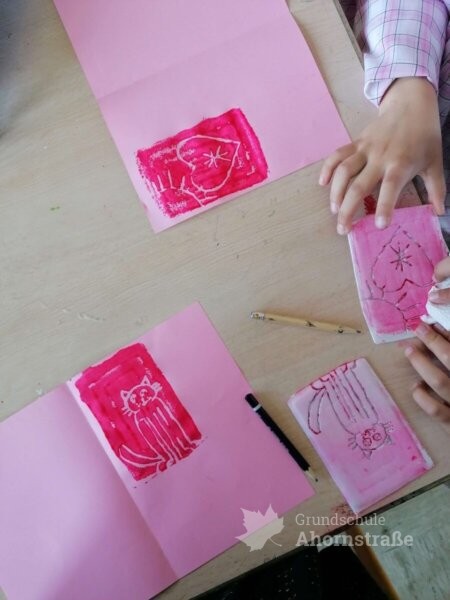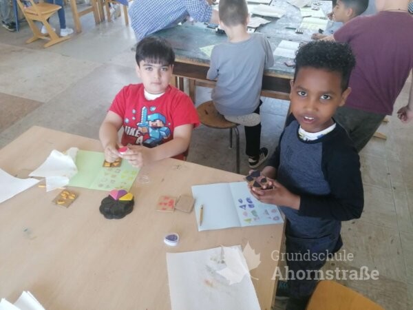 Frau Geers vom Atelier FreiRaum kam zu den Kindern in die Schule und hat gezeigt, wie man Stempel und Druckplatten herstellt.