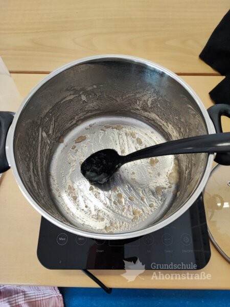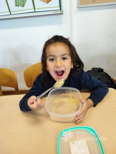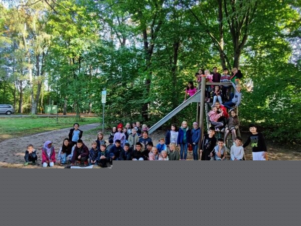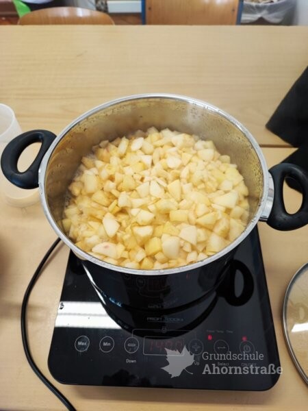 Die Klassen 1b kocht Apfelkompott und besucht mit ihrer Patenklasse 4b den Spielplatz