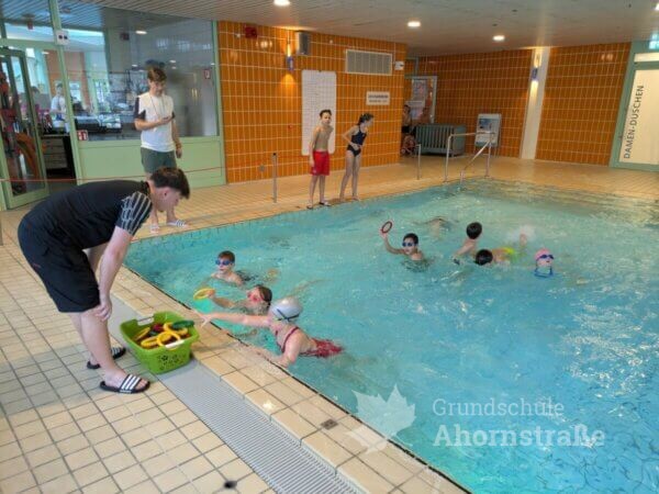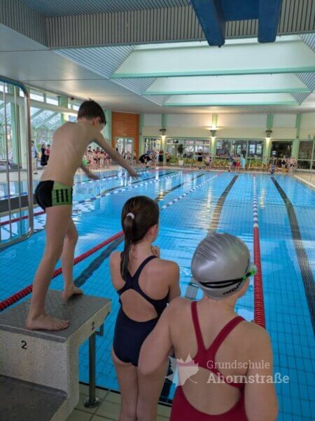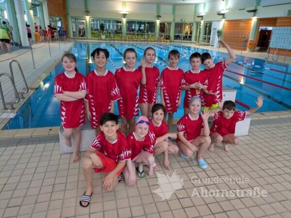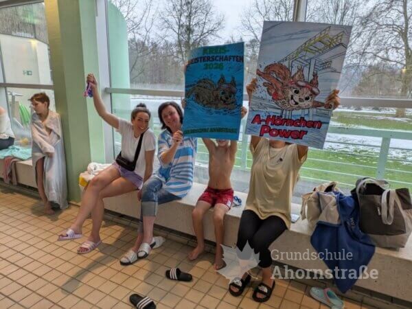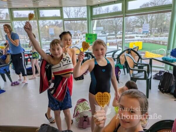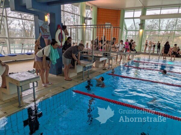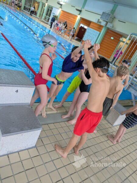 Am 2.2. fanden die Kreismeisterschaften im Schwimmen in Lemgo statt. Die Grundschule Ahornstraße nahm mit 6 Mädchen und 6 Jungen aus den 3. und 4. Klassen teil. Es gab 5 Disziplinen (T-Shirt-Staffel, Sprint-Staffel, Ausdauerstaffel, Transportstaffel und Ringe-tauchen) in denen die Kinder alles gaben. Am Ende erreichten wir einen 5. Platz und erhielten eine Urkunde sowie ein neues Beachboard. Ein großer Dank geht auch an die Eltern, die zahlreich vor Ort unterstützten, lautstark anfeuerten und die Kinder kulinarisch verwöhnten.