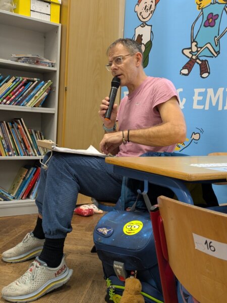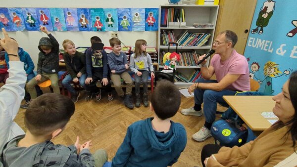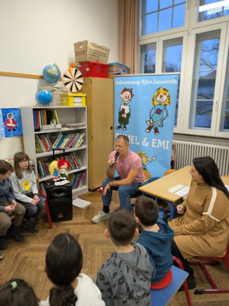 Am 3.2. kam der Autor Björn Sassenroth in die ersten Klasse und erzählte von seiner Arbeit. Ein Teil dieser Arbeit ist das Schreiben und Einsprechen von selbst geschrieben Geschichten. Er las uns eine dieser Geschichten zum Thema „Glück“ mit den Charakteren Eumel und Emi vor. Die Kinder lauschten gespannt und konnten anschließend noch Fragen stellen. Mit seiner positiven und kindbezogenen Art konnte Herr Sassenroth die Kinder schnell begeistern und er versuchte noch ein bisschen Werbung für das Lesen zu machen. Am Ende erhielten die Klassen noch die Stoffpuppe „Eumel“ sowie QR-Codes für drei Gratis-Hörgeschichten. Ein großer Dank geht neben Herrn Sassenroth an die Bürgerstiftung, die diese Lesung finanziert und somit ermöglicht hat.