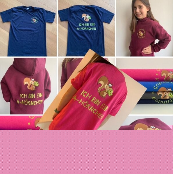 „Zum Start des neuen Schulhalbjahres präsentieren wir hochwertige T-Shirts und Hoodies unserer Schule, mit exklusivem Aufdruck „Grundschule Ahornstraße“ (vorn) und „Ich bin ein A-Hörnchen“ mit einem Ahörnchen (hinten).