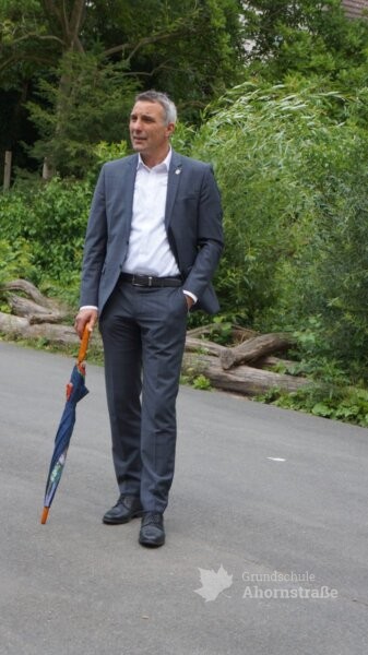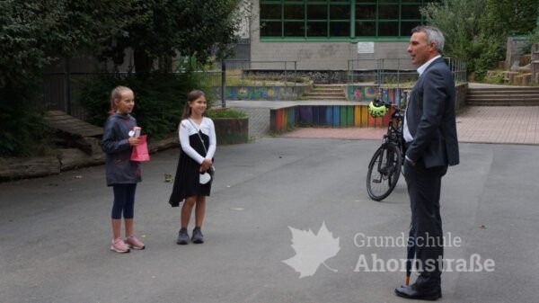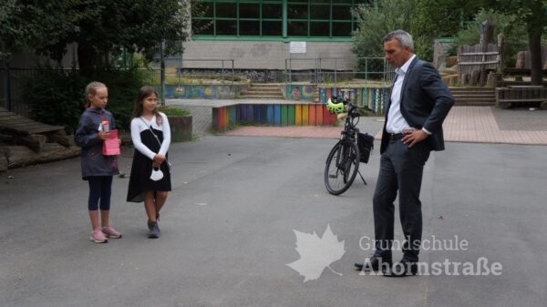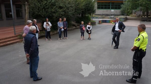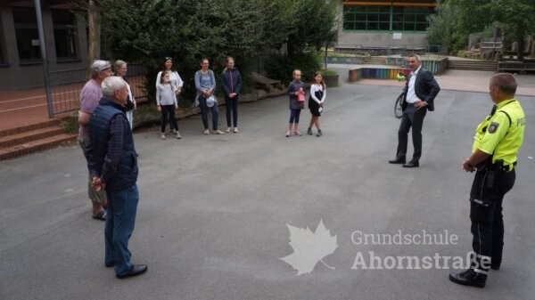 Heute besuchte uns unser Bürgermeister Herr Tolkemitt erneut! Am 4. Mai folgte er der Einladung von Anna und Giulia. Der Anlass war die immer mehr zunehmende Vermüllung unseres Schulhofes und der ständige Vandalismus in den Abend- und Nachtstunden. Herr Tolkemitt versprach den Kindern, dass der Schulhof ganz bald abgeriegelt werden wird. Eine andere Möglichkeit sah er leider nicht mehr, nachdem die Kontrollbesuche des Ordnungsamtes und eines Sicherheitsdienstes nicht die gewünschte Änderung brachten. Und unser Bürgermeister hielt Wort! Seit einigen Tagen stehen bereits zwei Tore. Daher trafen heute neben dem Bürgermeister noch Giuila und Anna (sie hatte heute Geburtstag!), Frau Daubel-Wiele, Herr Küstermann, zwei Elternvertreterinnen, ein Anwohner und Herr Tünker von der Polizei zu einer kurzen Lagebesprechung zusammen.